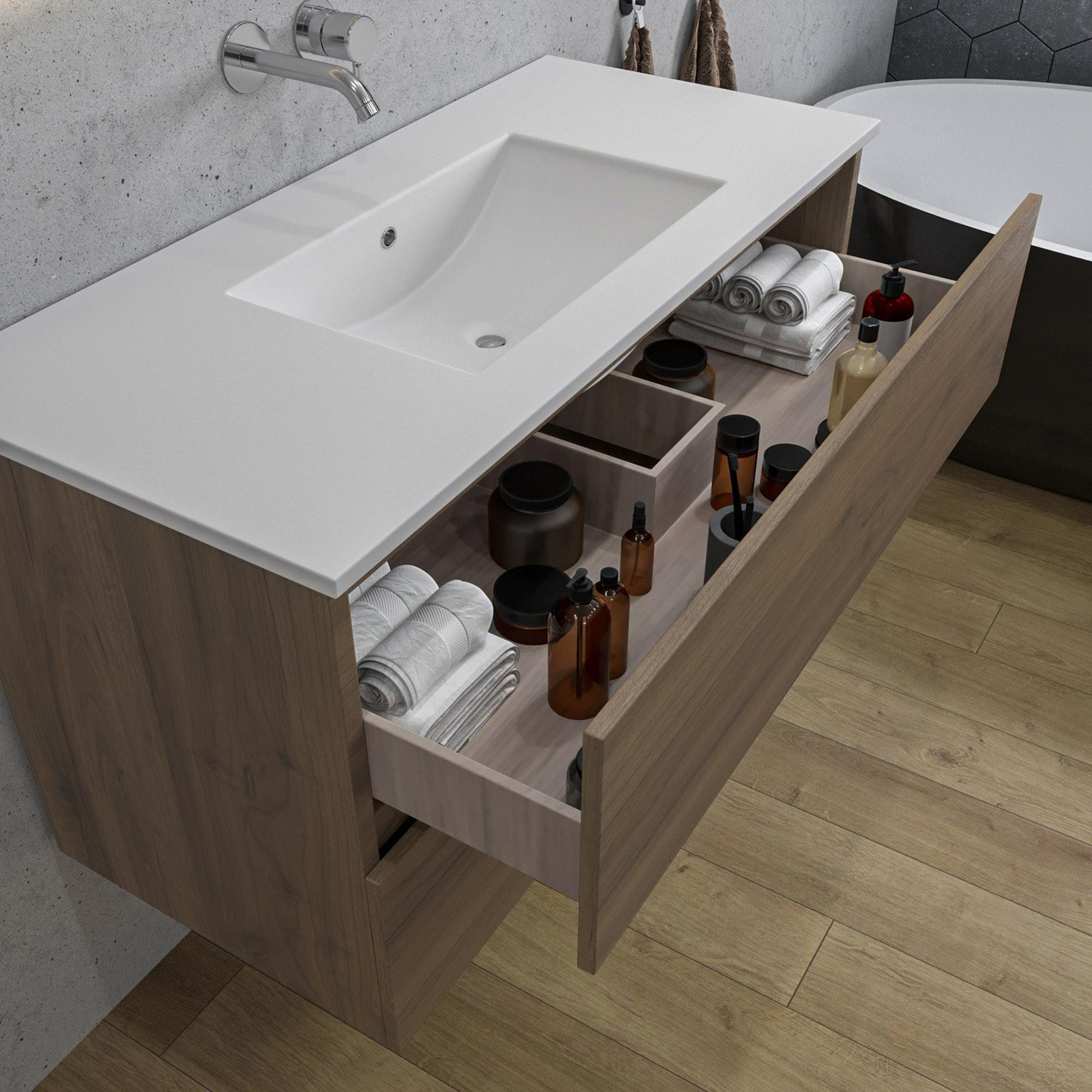 Saniclass Chaci Ensemble meuble de salle de bains - 100x46x57cm - lavabo en céramique blanc - 1 vasque - sans trous de robinet - 2 tiroirs - armoire de toilette - noyer (bois)