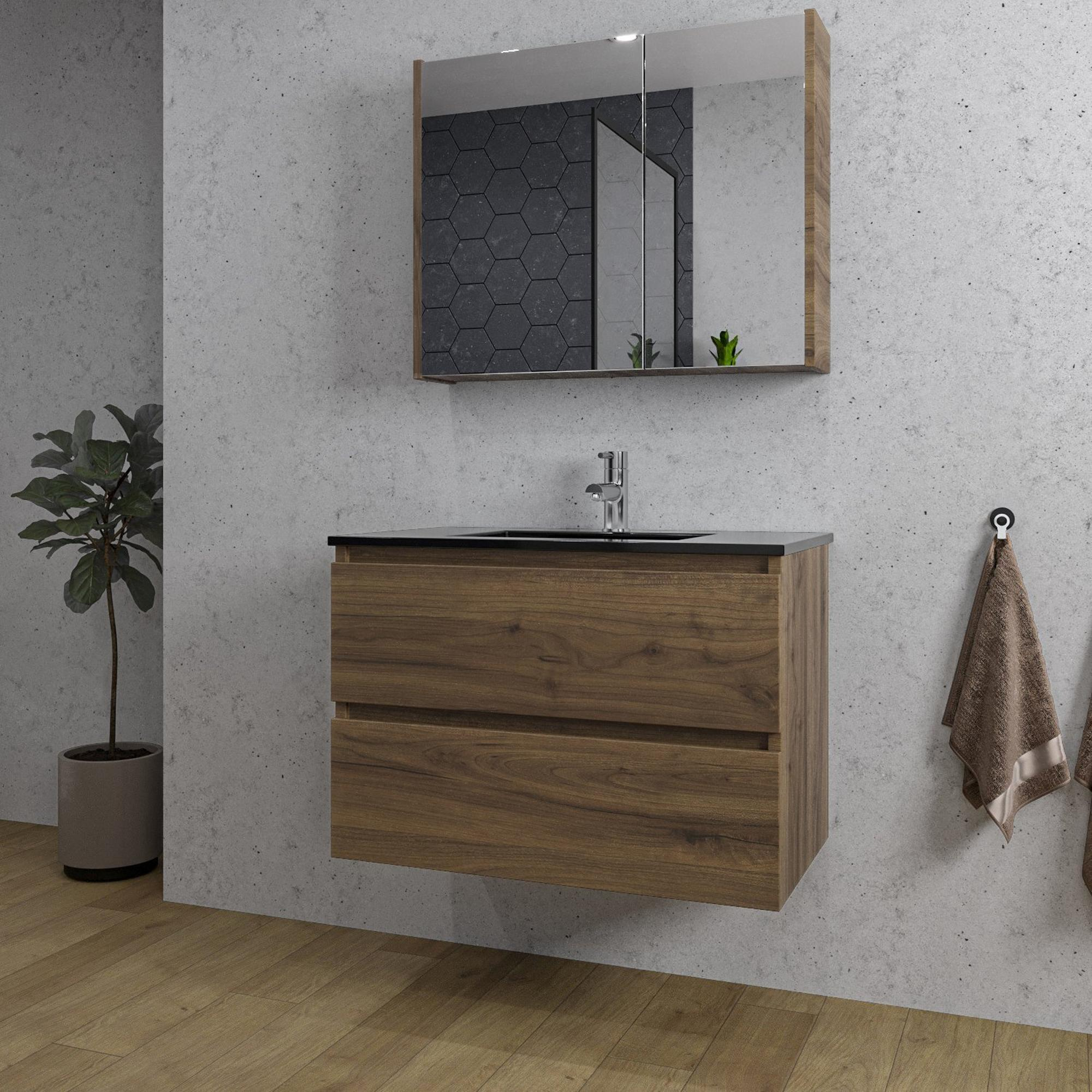 Saniclass Chaci Ensemble meuble de salle de bains - 80x46x55cm - vasque en céramique noire - 1 lavabo - 1 trou de robinet - 2 tiroirs - armoire de toilette - Noyer (bois)