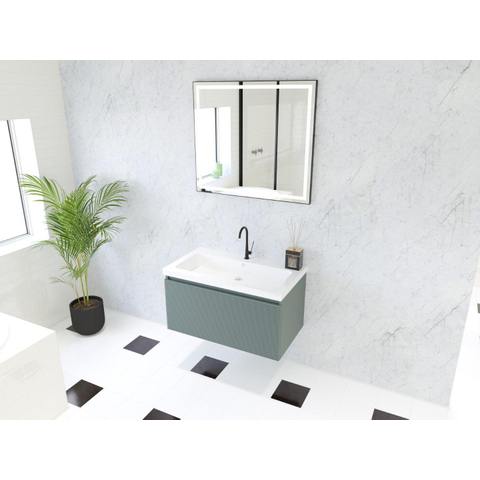 Le meuble possède une façade 3D élégante en petrol mat qui donne immédiatement du caractère à votre salle de bains. La version sans poignées avec profil de prise intégré dans la même couleur assure une apparence minimaliste sans interruptions dans les façades. Cela crée non seulement un aspect apaisant, mais met également parfaitement en valeur la couleur et la texture du meuble en MDF. Grâce aux lignes horizontales du tiroir de 80 cm de large, vous créez en outre visuellement plus de largeur dans l’espace, ce qui peut faire une grande différence, surtout dans les petites salles de bains. Combinez par exemple le meuble avec un miroir ou un miroir-armoire fin en noir ou en blanc pour apporter un équilibre parfait à l’ensemble.
