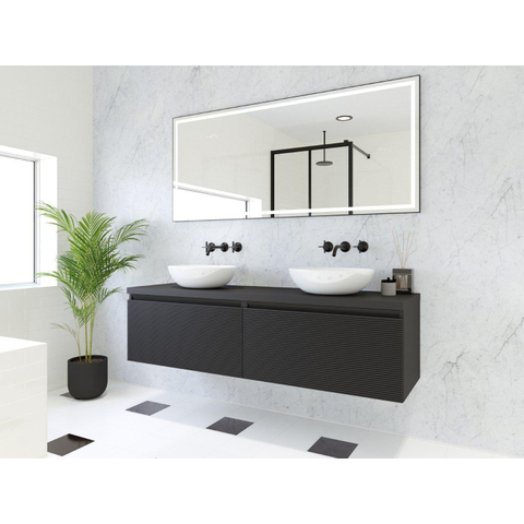 La combinaison de la façade 3D et de la finition entièrement noire mate crée un aspect puissant et apaisant. Le plan de dessus et le profil de préhension sont réalisés dans la même couleur, ce qui forme un ensemble épuré sans lignes perturbatrices. Cela rend le meuble parfait pour une salle de bains design à l'allure minimaliste, mais il trouve également parfaitement sa place dans un style industriel ou hôtel chic. Le large plan se prête en outre très bien à un ou deux lave-mains à poser, afin que vous puissiez choisir vous-même vos vasques et robinets préférés et ainsi ajouter une touche personnelle.