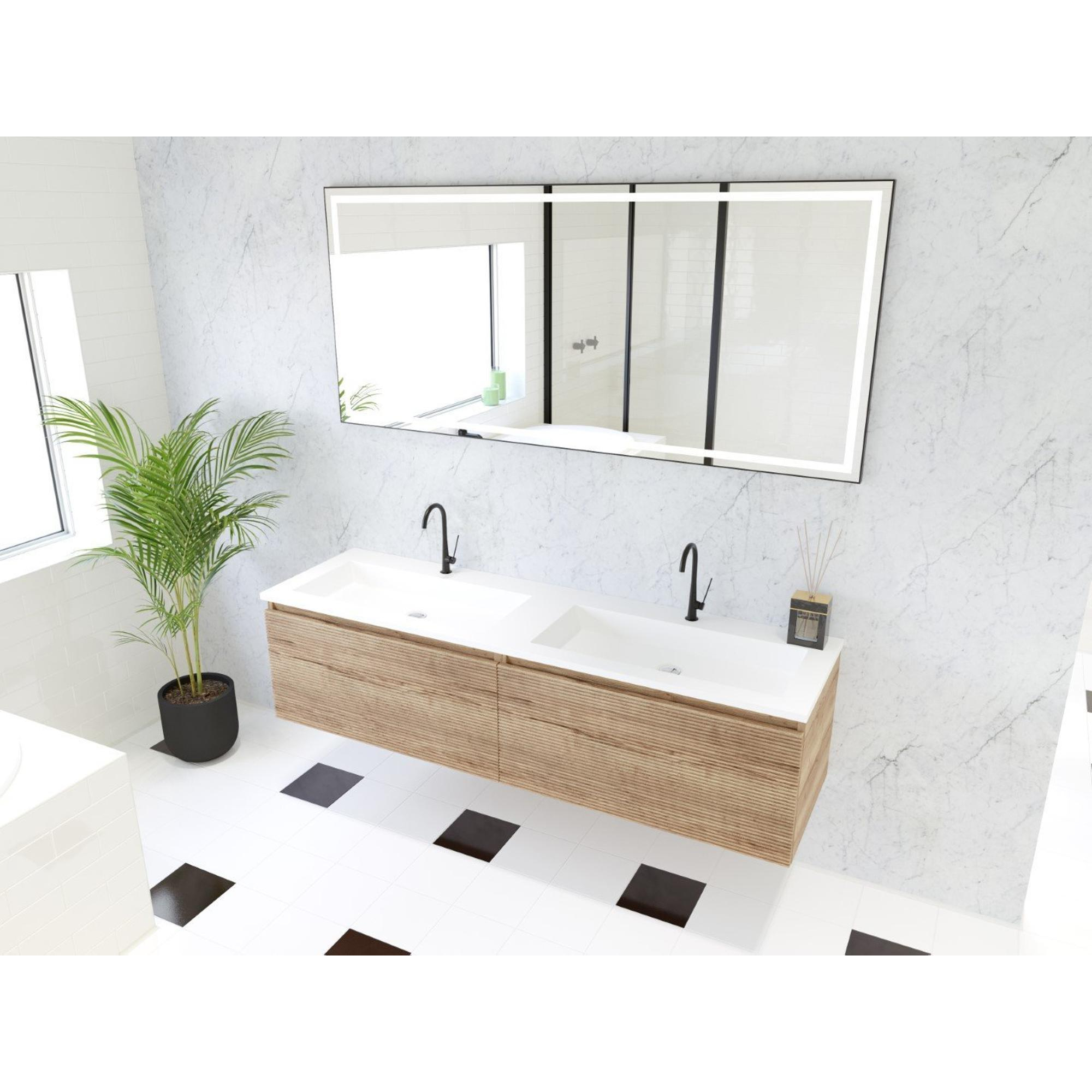 Cet ensemble complet est idéal si vous êtes à la recherche d’une base moderne et apaisante pour une vaste salle de bains familiale ou un espace luxueux de type hôtel. Avec une largeur généreuse de 160 cm, un lavabo au design fin et deux larges tiroirs, ce meuble offre tout l’espace dont vous avez besoin pour ranger articles de toilette, serviettes et produits de soin quotidiens. Le design sans poignées avec un profil de préhension dans une chaleureuse teinte bois s’accorde parfaitement avec les intérieurs scandinaves, modernes et naturels. Le lavabo mat et mince avec deux trous de robinet rend le meuble particulièrement adapté aux foyers très fréquentés ou à deux personnes qui aiment utiliser le lavabo en même temps. Vous combinez ainsi style, sérénité et facilité d’utilisation pratique dans une solution de salle de bains bien pensée.