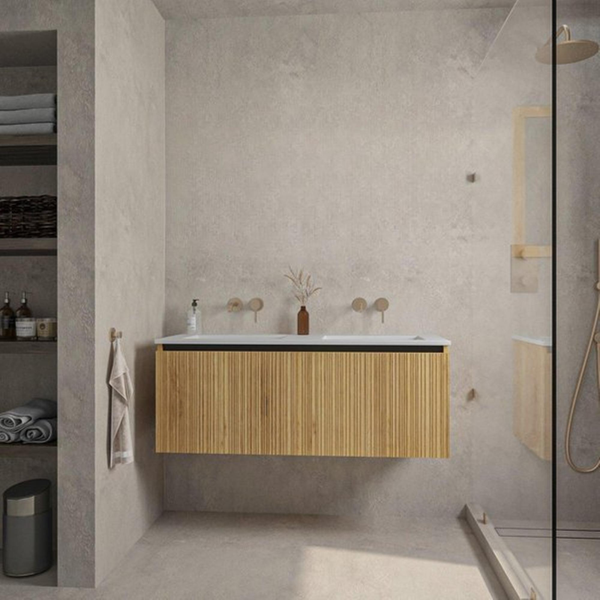 La combinaison du chêne chaleureux avec les vasques céramiques blanches et épurées assure un aspect intemporel et élégant. Ce meuble s'intègre sans effort dans différents styles de salle de bains, du moderne au classique. Les façades à nervures subtiles donnent à l'ensemble une texture raffinée qui confère au meuble ce petit plus de caractère. Ainsi, votre salle de bains devient non seulement un espace fonctionnel, mais aussi un lieu invitant à la détente et au confort. Avec ce meuble, vous apportez un véritable point fort qui donne immédiatement à votre salle de bains une allure luxueuse.