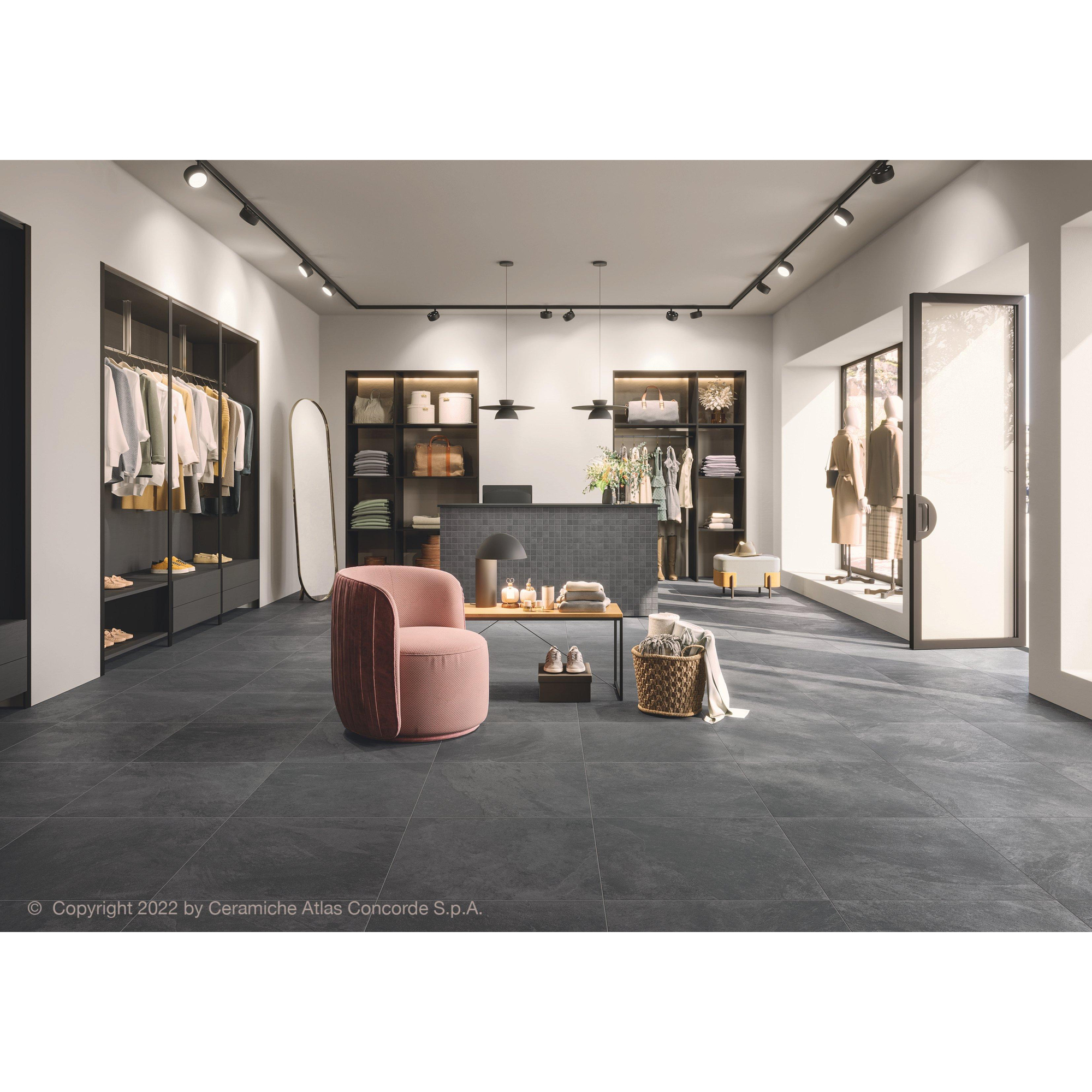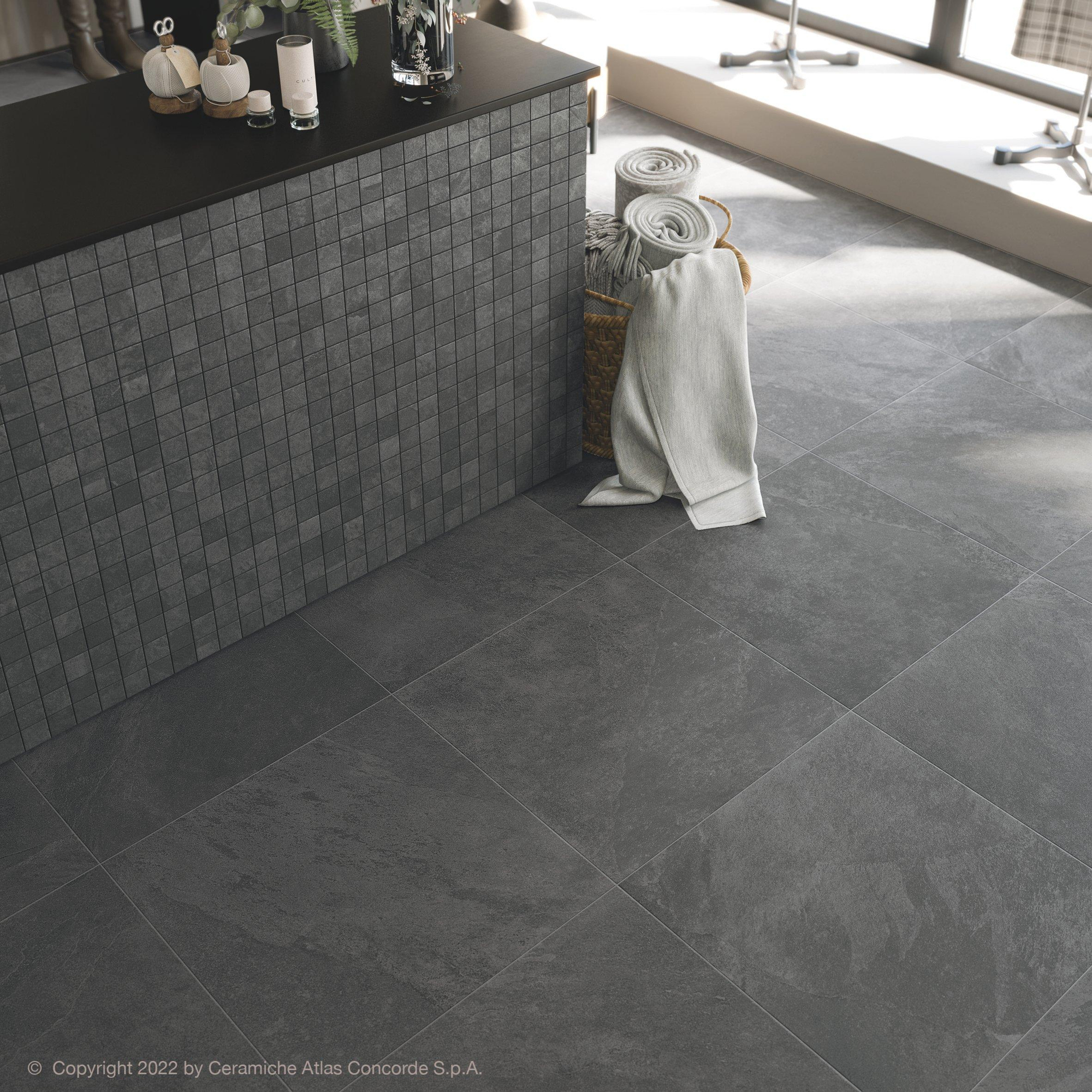 Le carreau Atlas Concorde Solution en noir peut être décrit comme magnifique. Son aspect pierre naturelle confère une allure luxueuse à chaque espace. Le noir profond ajoute une touche d’élégance et crée une ambiance intemporelle. Ce carreau est parfait pour ceux qui recherchent une atmosphère raffinée et stylée.