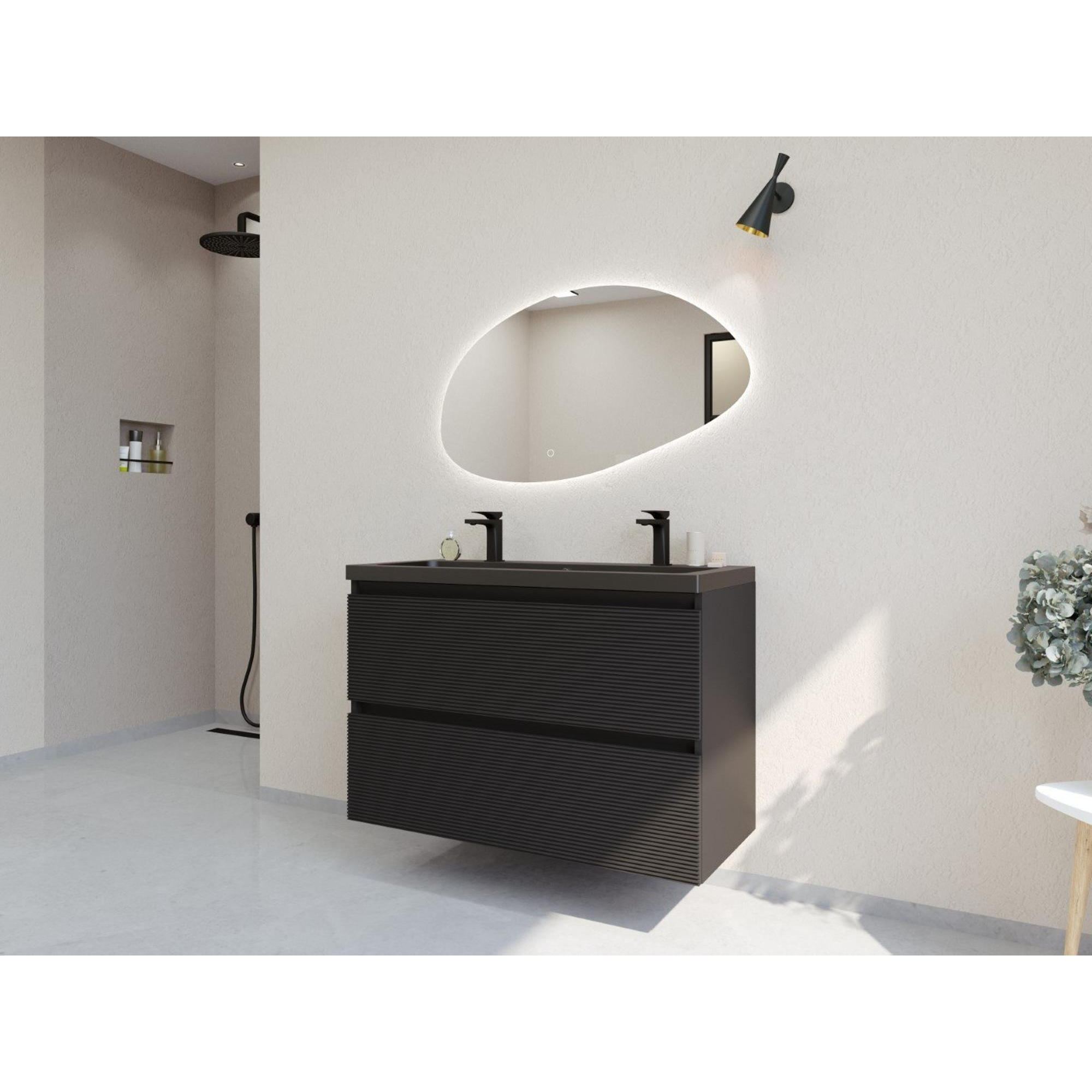 HR badmeubelen Infinity XXL 3D Ensemble meuble de salle de bains - 100 cm - 1 lavabo en céramique djazz noir mat - 2 trous de robinet - 2 tiroirs - noir mat