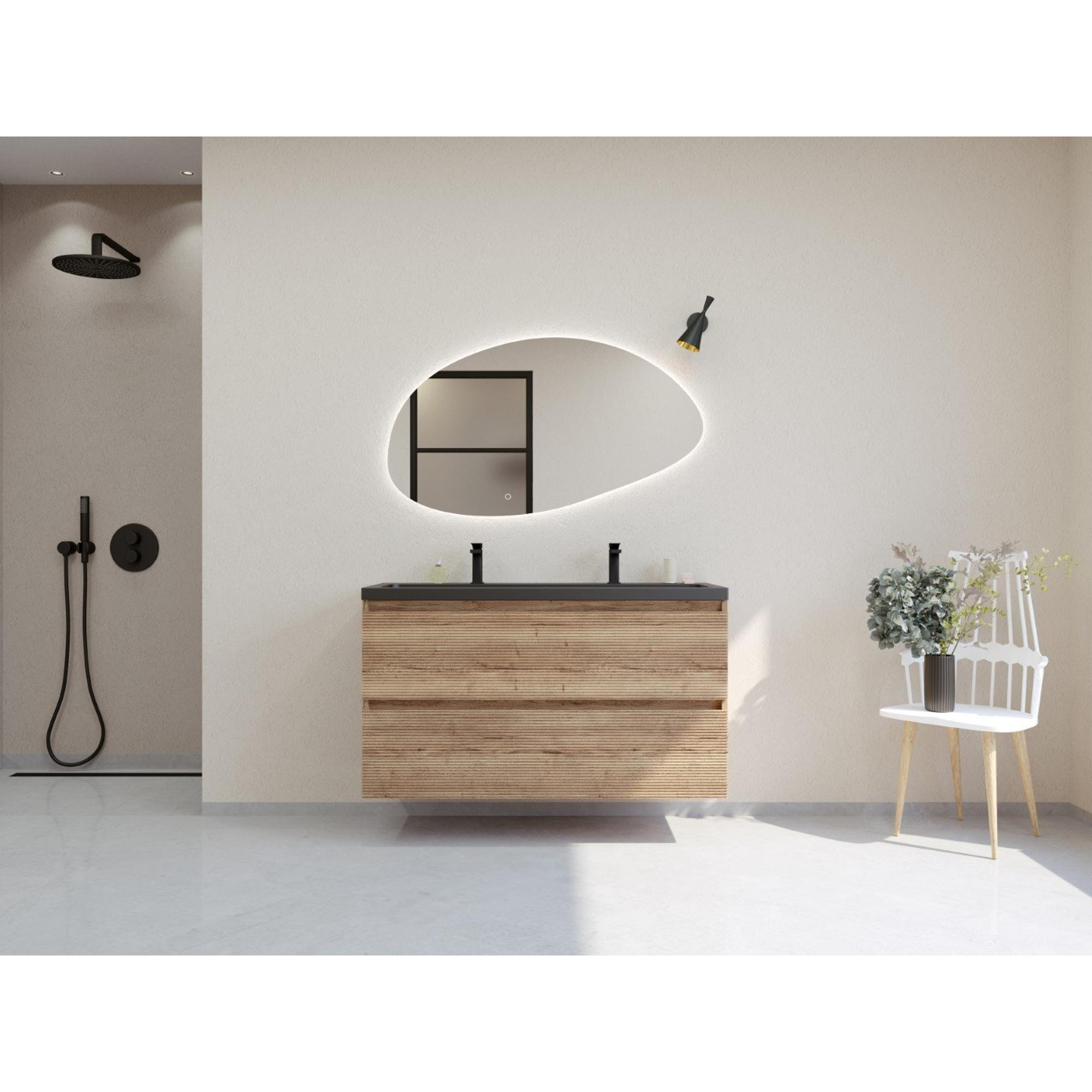 L'ensemble meuble de salle de bains HR badmeubelen Infinity XXL 3D respire le style et l'élégance. Le design est moderne et intemporel, ce qui le rend parfaitement adapté à divers styles de salles de bains. Le lavabo en céramique noir mat ajoute une touche de luxe, tandis que la finition chêne français apporte une apparence chaleureuse et naturelle. Ce meuble de salle de bains est un véritable accroche-regard dans chaque salle de bains et donne à la pièce une apparence raffinée.