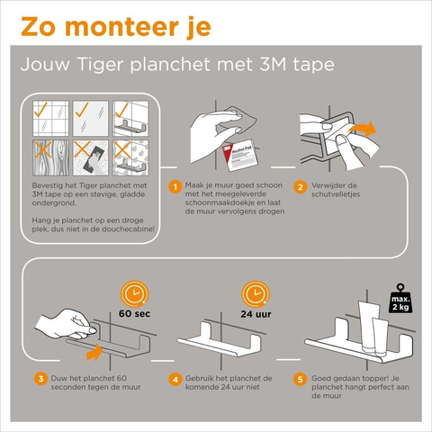 Pas envie de percer ou de chercher les chevilles adéquates ? Cette étagère est livrée avec une fixation murale autocollante munie d’un adhésif 3M puissant, ce qui vous permet de la fixer solidement sur une surface lisse et dégraissée. L’installation est ainsi rapide et simple, même si vous avez peu d’expérience en bricolage. La lingette de nettoyage fournie vous aide à bien préparer le support afin d’optimiser l’adhérence. Vous évitez en outre d’endommager les carreaux ou les conduites situées derrière le mur, ce qui est souvent rassurant dans les constructions neuves et les logements en location. Grâce aux instructions de montage claires, l’étagère est rapidement posée à niveau et prête pour un usage quotidien.