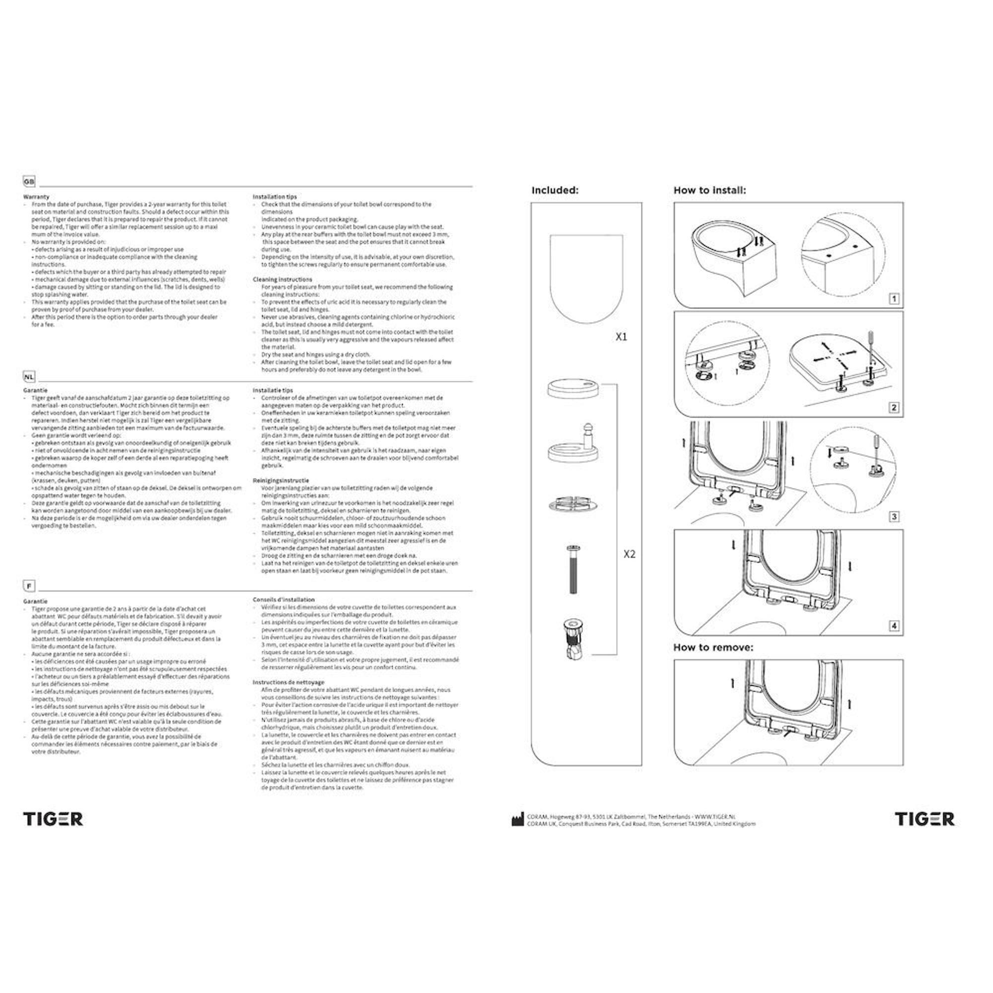 Tous les produits Tiger sont soumis à des contrôles approfondis. Rien n'est laissé au hasard. Acheter un produit Tiger, c'est acheter un produit de qualité. Si votre produit Tiger présente un défaut, vous pouvez compter sur Tiger. La période de garantie de votre produit Tiger se retrouve au dos de l'emballage. Les meubles de salle de bains et cabines de douche Tiger bénéficient d'une garantie de 3 ans, les accessoires et produits robinetterie d'une garantie de 5 ans et les abattants WC 2 ans.