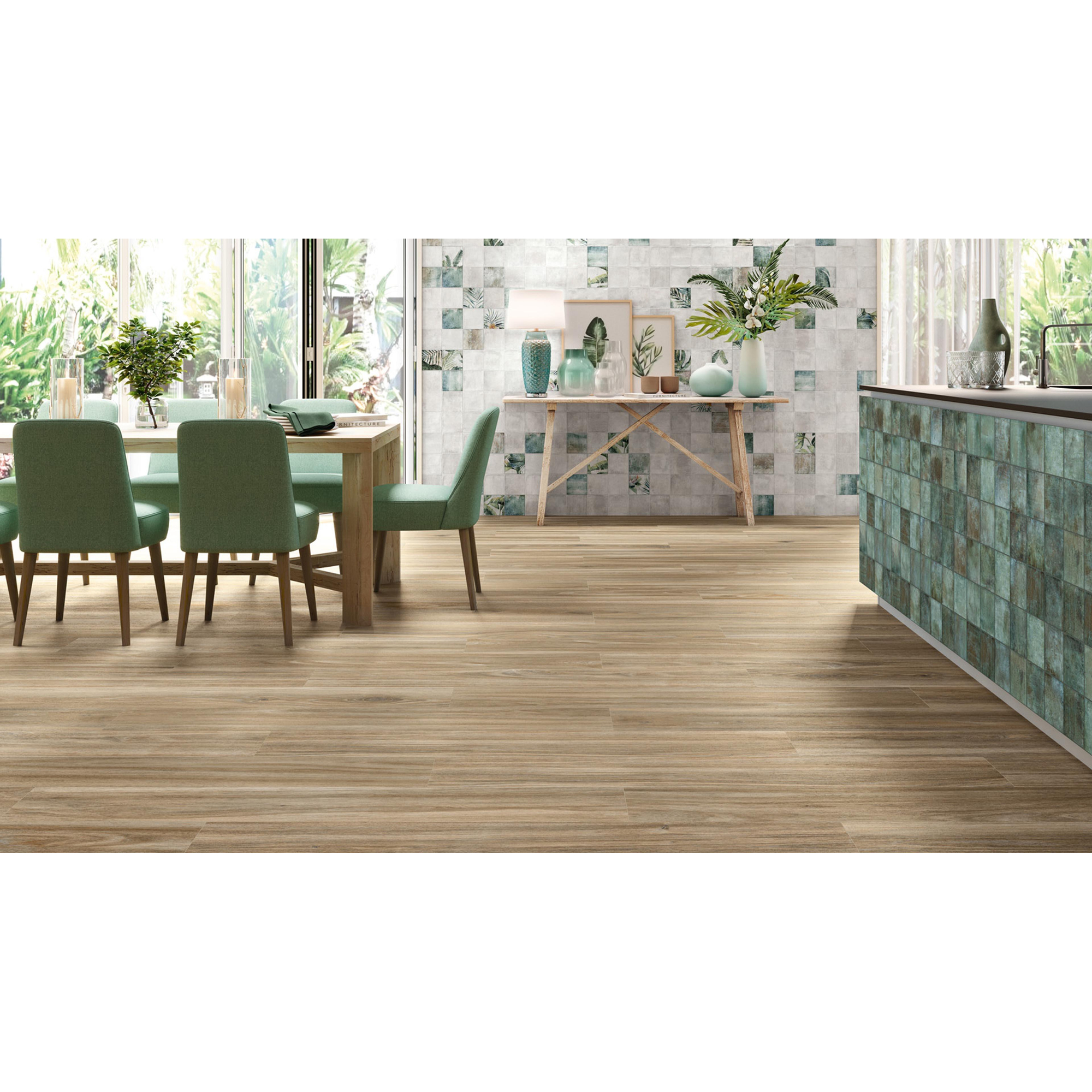 Les bords rectifiés permettent de travailler avec des joints étroits, ce qui donne un résultat final net et luxueux. Surtout pour des formats longs comme celui-ci, cela profite à l’apparence : vous voyez davantage le « bois » et moins les joints. Avec une épaisseur de 9 mm, le carreau offre une sensation solide et qualitative, tandis que la valeur antidérapante R9 garantit une adhérence supplémentaire dans les pièces sèches et légèrement humides. C’est appréciable, par exemple, dans la salle de bains ou l’entrée, où l’on souhaite un peu plus de sécurité. Combinez éventuellement ce carreau avec un chauffage par le sol pour encore plus de confort