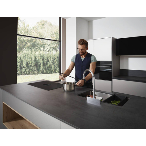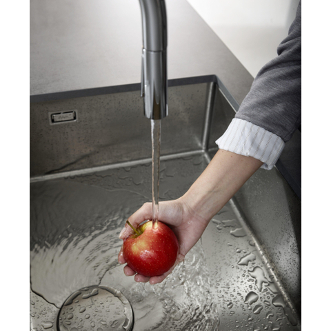 Le robinet est conçu pour votre confort. La douchette extractible avec trois types de jets différents – cristallin, doux et anti-éclaboussures – permet d'utiliser l'eau exactement comme vous le souhaitez. Le boîtier pour le tuyau assure un rangement soigné et prolonge le bec jusqu'à 76 cm, vous offrant plus de liberté de mouvement lors de la cuisson et du nettoyage. Le robinet est également pivotant en quatre positions réglables, vous permettant de l'ajuster parfaitement à votre évier. Tout cela contribue à une utilisation plus efficace et agréable en cuisine.