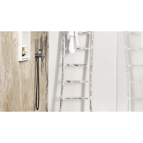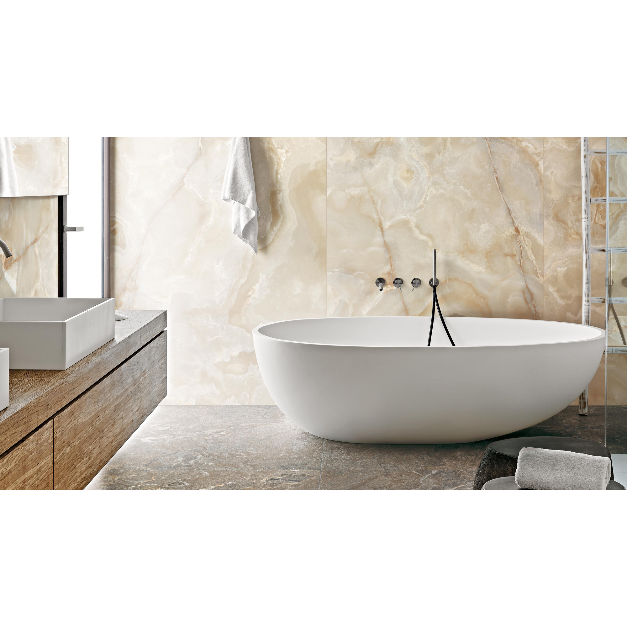 Le chaleureux effet golden onyx avec couche brillante crée une atmosphère chic, presque semblable au marbre dans votre salle de bains. Les veinures naturelles apportent profondeur et variation, de sorte que votre mur ou votre sol ne paraît jamais plat mais au contraire riche et vivant. Grâce à la finition haute brillance, la lumière se réfléchit subtilement, ce qui crée un effet d’espace, en particulier dans les petites salles de bains ou toilettes. Combinez cette mosaïque avec des carreaux de plus grand format de la même série ou avec des carreaux unis et sobres pour former un ensemble harmonieux. Vous donnez ainsi à votre salle de bains une ambiance d’hôtel haut de gamme, mais avec les avantages pratiques de la céramique.Format mosaïque pratique pour des applications créatives