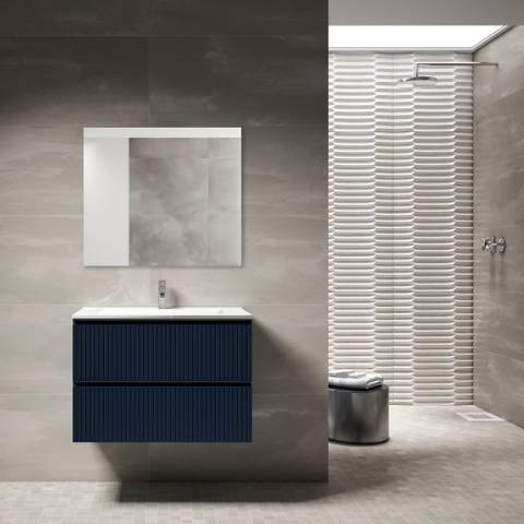 Saniclass Prime Blend Ensemble meuble de salle de bains - 80x55x46cm - 1 vasque ovale en céramique blanche - 1 trou de robinet - 2 tiroirs - miroir rectangulaire - bleu marine mat
