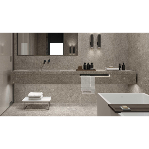 L’aspect pierre naturelle de ce carrelage apporte immédiatement de l’ambiance à la pièce, sans les inconvénients de la véritable pierre naturelle. La couleur taupe elegance est à la fois chaleureuse et chic : suffisamment neutre pour suivre votre style d’intérieur pendant des années, mais suffisamment distinctive pour donner à votre salle de bains juste ce petit supplément de caractère. Grâce aux nuances de couleur subtiles et au décor discret, il en résulte une allure élégante, digne d’un hôtel. Cela rend ce carrelage idéal comme base pour différents styles, allant du moderne industriel avec des accents noirs à une salle de bains plus sereine de type spa avec des tons de bois clairs et des textiles doux. Comme le carrelage n’est pas criard, vous pouvez jouer avec des accessoires et des éléments sanitaires marquants sans que l’ensemble ne devienne trop chargé.