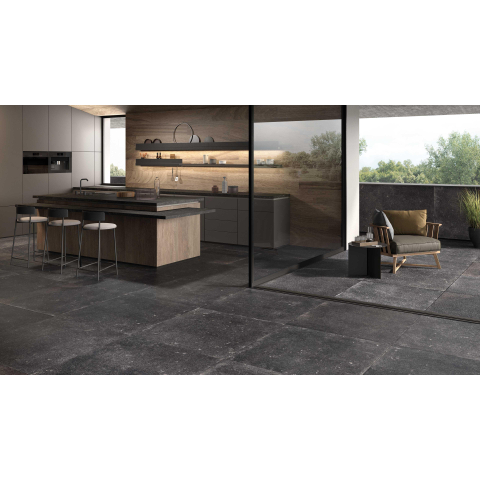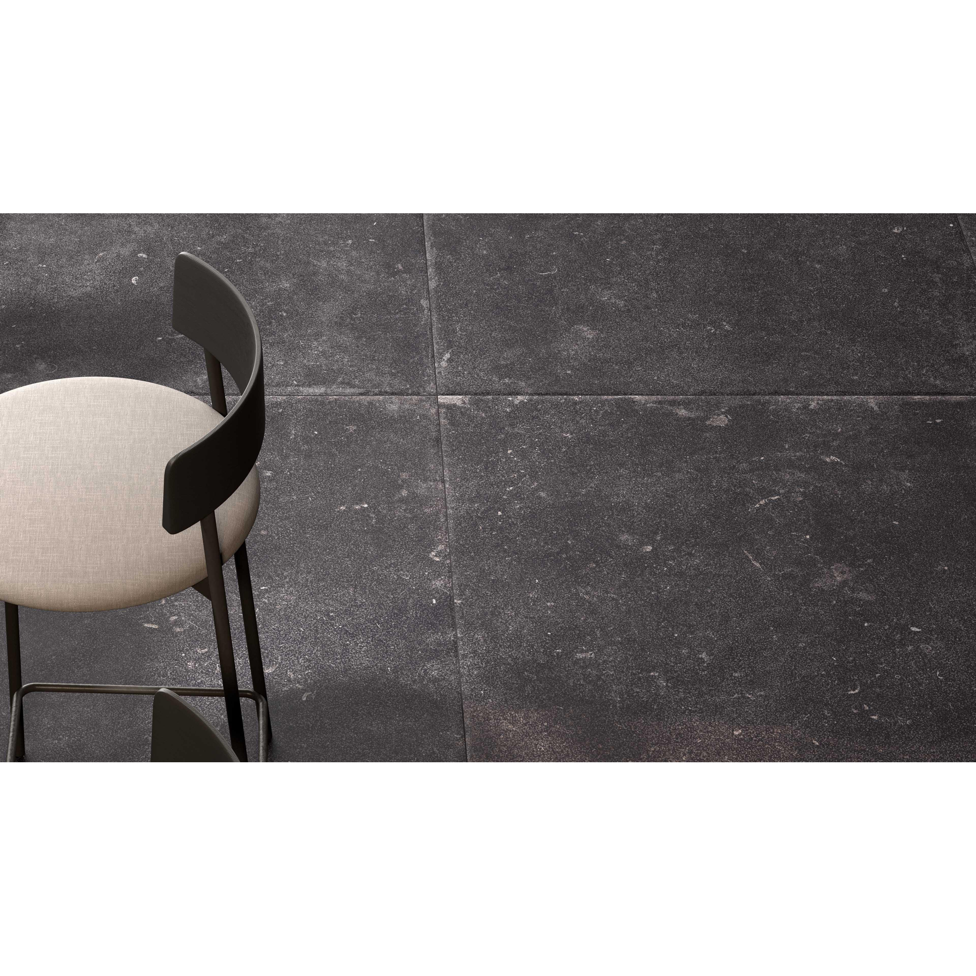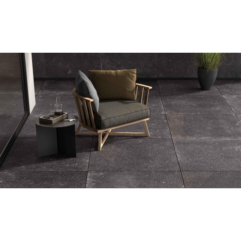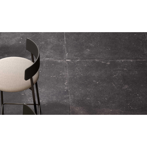 Avec son format de 100x100 cm et ses bords rectifiés (coupés droit), ce carreau s’ajuste parfaitement, ce qui permet de créer avec des joints fins un sol ou un mur quasi continu. La couleur Noir combinée à l’aspect pierre naturelle donne de la profondeur et du caractère, sans être trop chargée. Cela rend ce carreau particulièrement adapté aux salles de bains modernes, aux douches à l’italienne luxueuses et aux intérieurs minimalistes. La finition mate évite les reflets gênants, ce qui rend l’espace plus paisible et met particulièrement en valeur les matériaux comme le bois, la céramique blanche et les robinetteries noires. Vous posez ainsi d’un seul coup une base forte, à la fois robuste et élégante.