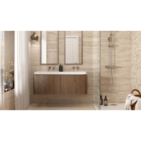 L’apparence de ce carreau s’accorde parfaitement avec la tendance populaire de l’effet travertin et pierre naturelle, mais avec tous les avantages de la céramique. Le veinage subtil et la couleur sable apaisante offrent à votre intérieur une base naturelle et chaleureuse dont on ne se lasse pas facilement. Dans les salles de bains modernes, vous le combinez sans effort avec des robinets noirs mats ou en laiton brossé pour une sensation de spa luxueux, tandis que dans un style campagnard ou méditerranéen, il se marie particulièrement bien avec le bois et des tons doux. Comme la finition de couleur est mate, le carreau paraît chic et discret, sans brillance ni motif chargé. Vous créez ainsi un intérieur qui est tendance aujourd’hui, mais qui restera tout aussi élégant dans dix ans.