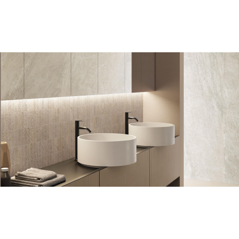 La série est inspirée par l’élégance de la pierre naturelle, mais avec tous les avantages de la céramique. La teinte blanche aux nuances subtiles donne à votre espace un caractère frais et spacieux, sans devenir froid. Comme la surface est plane et mate, les grandes surfaces paraissent sobres et chic, idéal si vous souhaitez créer chez vous une salle de bains design ou une ambiance bien-être. Le look pierre naturelle est en outre intemporel, de sorte que votre salle de bains ne se démode pas rapidement et que vous pouvez facilement l’associer à des tons boisés, des robinets noirs ou au contraire à de douces couleurs sable. Vous posez ainsi avec ce carreau une base haut de gamme qui évolue avec votre style de vie.