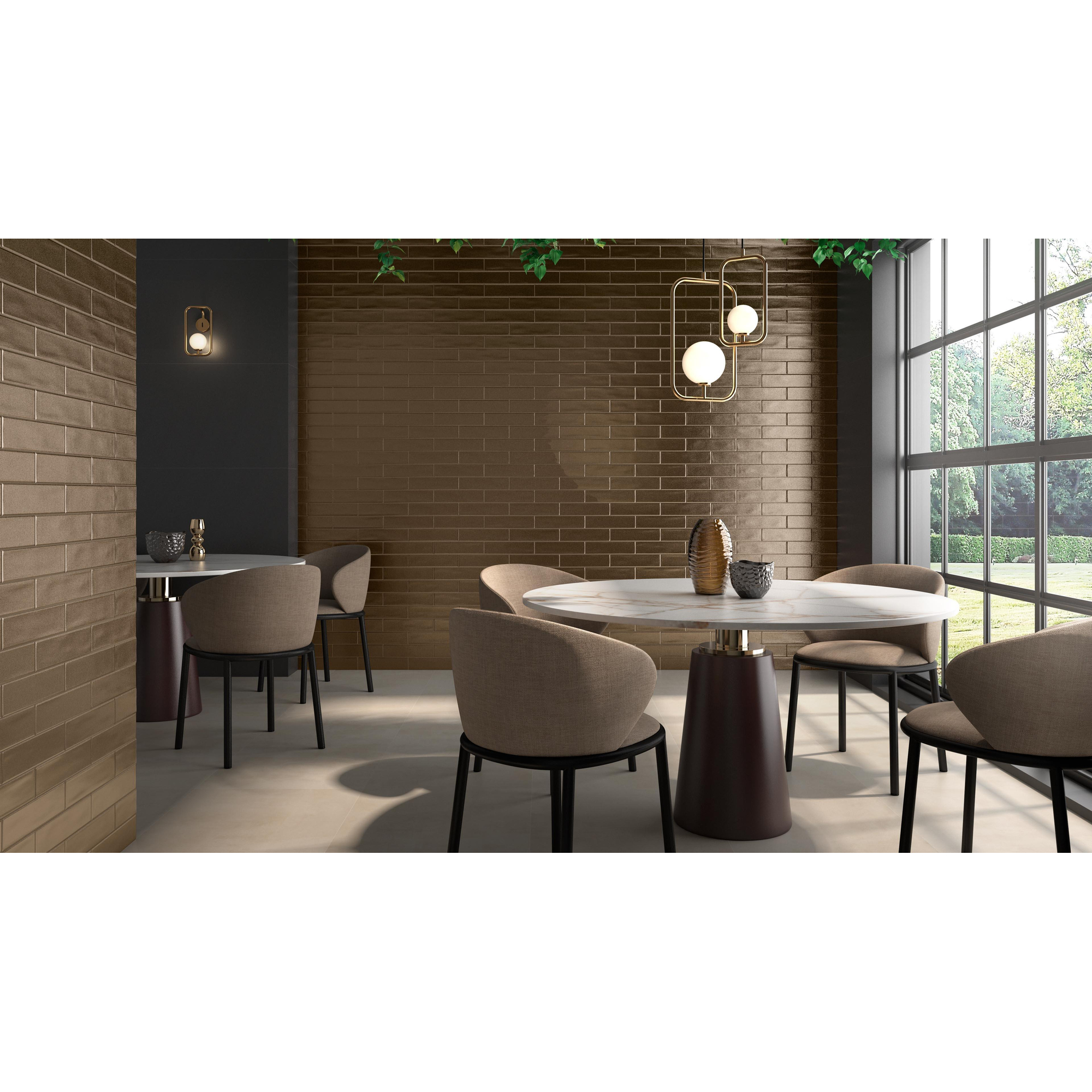 Avec ce carrelage mural raffiné, vous apportez un chaleureux aspect métal dans votre maison, sans renoncer à la facilité de la céramique. Le format compact est idéal pour créer des motifs ludiques dans la salle de bains, les toilettes ou la cuisine, par exemple en pose à mi-joint ou en chevrons. Grâce à la couleur brass brun mat et à la structure subtile, ce carrelage s’harmonise parfaitement avec les salles de bains modernes, industrielles et esprit hôtel de luxe. Si vous recherchez un mur accent dans la douche, derrière la baignoire ou comme crédence élégante derrière le meuble de salle de bains, c’est un choix judicieux. Même dans la cuisine, derrière la cuisinière ou en prolongement vers le hall, ce carrelage trouve parfaitement sa place. Surtout dans les petits espaces, le format élancé renforce l’impression d’espace et crée un aspect luxueux et sur mesure.