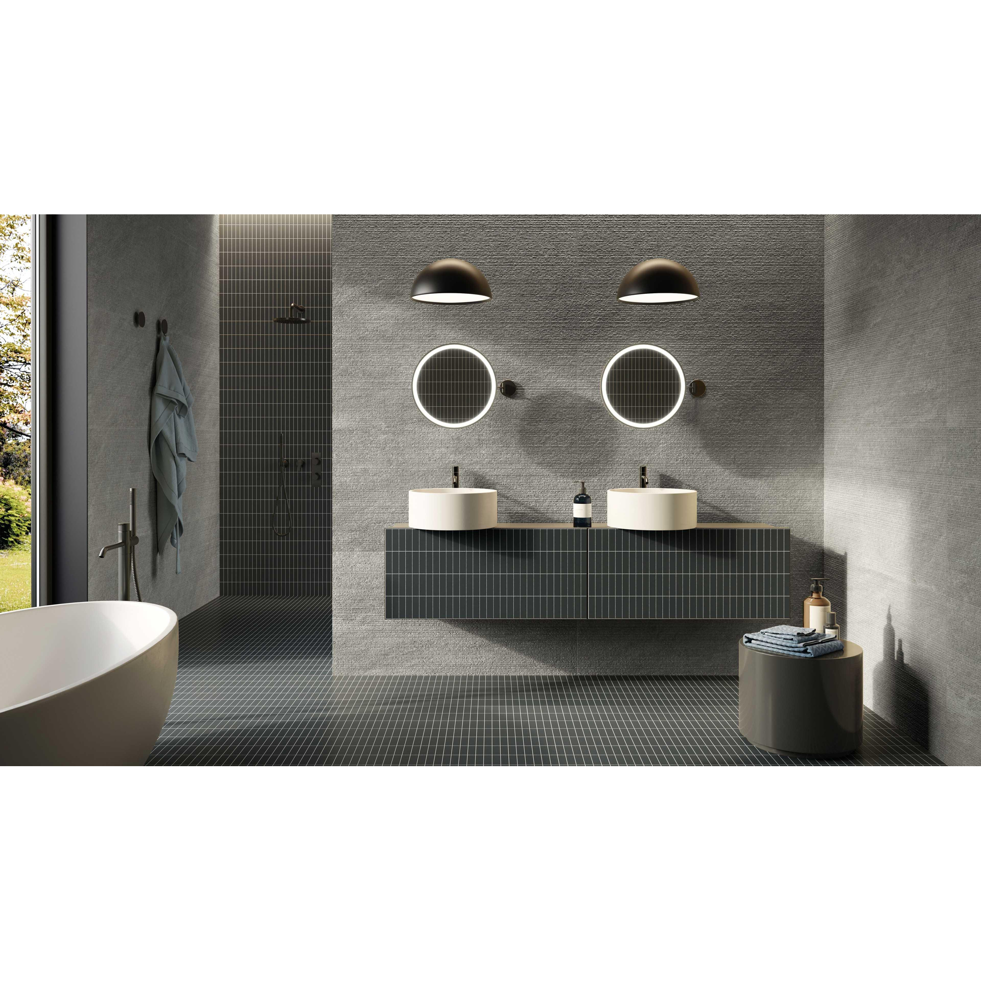 Avec ce grand carreau décoratif aspect pierre naturelle, vous donnez immédiatement à votre salle de bains ou à vos toilettes une apparence haut de gamme et sereine. Le grand format de 60x120 cm apporte du calme à l’espace grâce au nombre limité de joints, tandis que la subtile couleur gris argenté se combine aisément avec des produits sanitaires blancs, une robinetterie noire ou des tons bois chaleureux. Grâce à la surface mate et au léger relief, l’ensemble paraît luxueux mais néanmoins discret. Ce carreau est un choix judicieux si vous souhaitez créer un sol et un mur continus, par exemple dans une douche à l’italienne ou une grande salle de bains familiale, mais il convient également parfaitement aux petites salles de bains que vous souhaitez faire paraître visuellement plus grandes. Si vous recherchez un carreau céramique durable, aspect pierre, à la fois pratique et élégant, ce décor constitue la base idéale pour une conception de salle de bains intemporelle.