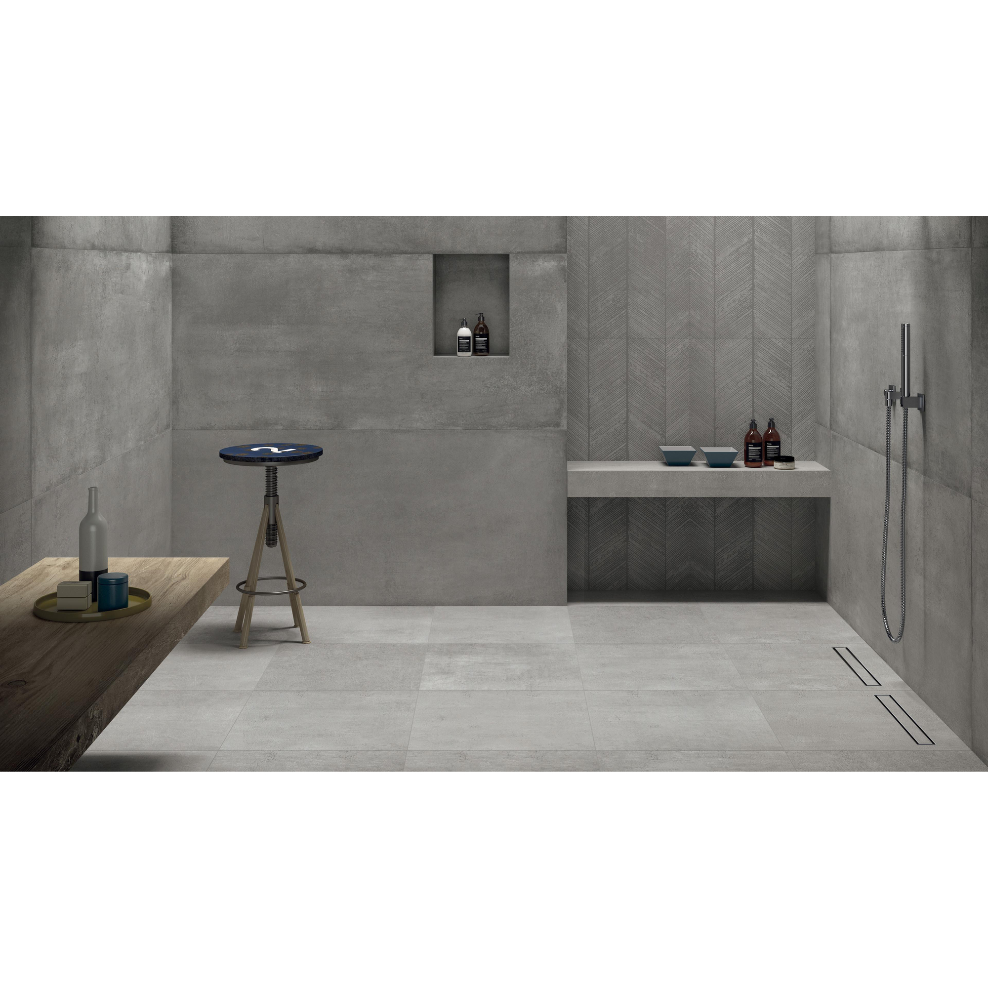 Avec ce carreau décoratif grand format, vous créez en une seule fois une base élégante et graphique dans votre salle de bains, vos toilettes ou votre pièce de vie. La combinaison de l’aspect béton dans la couleur Cemento et du motif décoratif subtil donne à votre intérieur un caractère moderne mais néanmoins intemporel. Grâce au grand format de 60x120 cm, une pièce paraît immédiatement plus spacieuse et plus calme, tandis que le décor ajoute justement une touche de jeu. Cela rend le carreau idéal comme mur d’accent dans la douche, derrière la baignoire ou derrière les toilettes, mais aussi comme sol luxueux dans une salle de bains design épurée ou une suite au style hôtel chic. Grâce à la finition mate et à la valeur antidérapante R10, il convient en outre aux zones très fréquentées et aux pièces humides, tandis que les bords rectifiés assurent des joints fins et réguliers et une image d’ensemble haut de gamme.