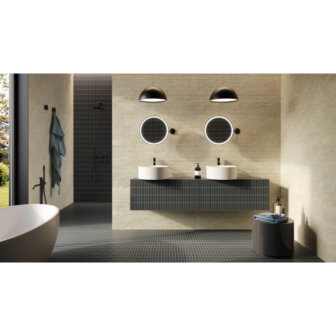Outre son design, ce carrelage mural est aussi un choix pratique. La finition mate évite les reflets gênants et les traces de doigts sont moins visibles que sur un carrelage brillant, ce qui est appréciable au quotidien. Le relief apporte de la profondeur, mais reste suffisamment discret pour être nettoyé facilement avec une brosse douce ou une éponge. Étant un carrelage mural en céramique, il est parfaitement adapté aux pièces humides comme la douche ou autour de la baignoire, à condition d’être posé et jointoyé correctement. Vous profitez ainsi du look de la pierre naturelle, mais avec la facilité d’entretien, la stabilité des couleurs et la praticité d’une céramique de haute qualité.