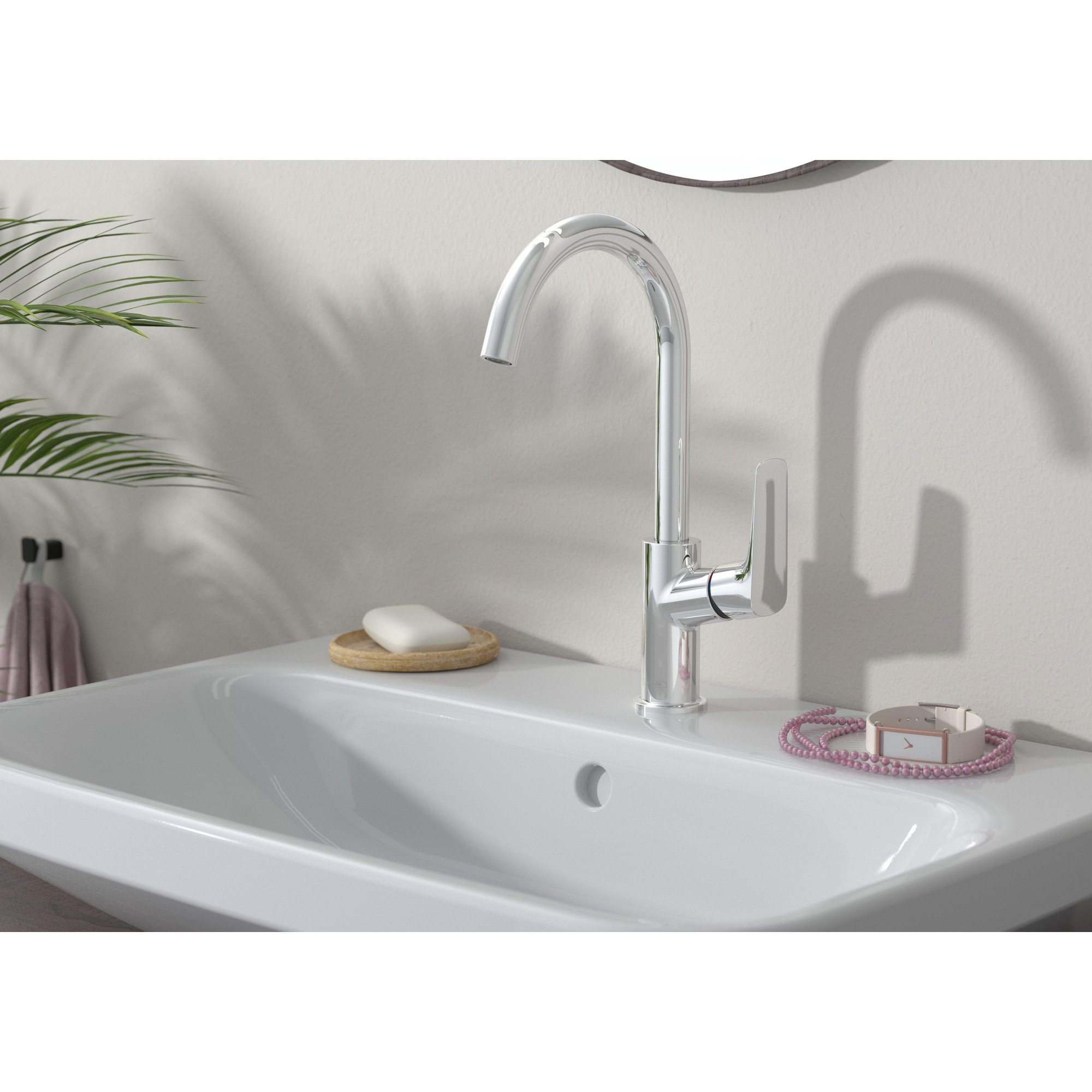 Le bec pivotant avec une amplitude de 120 degrés vous offre une liberté de mouvement supplémentaire lors de l'utilisation. Cela facilite par exemple le nettoyage du lavabo ou le remplissage d'objets plus grands. La poignée latérale est placée de manière ergonomique pour une utilisation simple et précise. De plus, le vidage à bouton-poussoir assure une finition soignée et une utilisation pratique. Grâce à la ComfortZone de 210 mm, vous disposez toujours d'assez d'espace pour vous laver les mains confortablement sans être gêné.