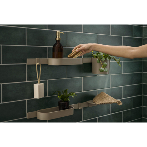 Avec cette magnifique tablette, vous donnez à votre salle de bains une apparence subtile et chaleureuse grâce à la douce couleur sable. Ce n'est pas un simple accessoire, mais un ajout intelligent qui rend votre expérience quotidienne de la douche beaucoup plus agréable. Grâce au design plat et à la fixation pratique sur le rail de montage, vous créez facilement un espace de rangement supplémentaire pour tous vos produits de douche. Ainsi, tout reste bien rangé et à portée de main, sans paraître encombré. De plus, ce produit contribue à un monde plus durable : il est fabriqué en plastique recyclé, ce qui vous permet de profiter de votre salle de bains en toute tranquillité, sachant que vous avez fait un choix conscient. La combinaison de fonctionnalité, d'écologie et d'un design élégant fait que votre salle de bains devient non seulement plus belle, mais aussi plus pratique.