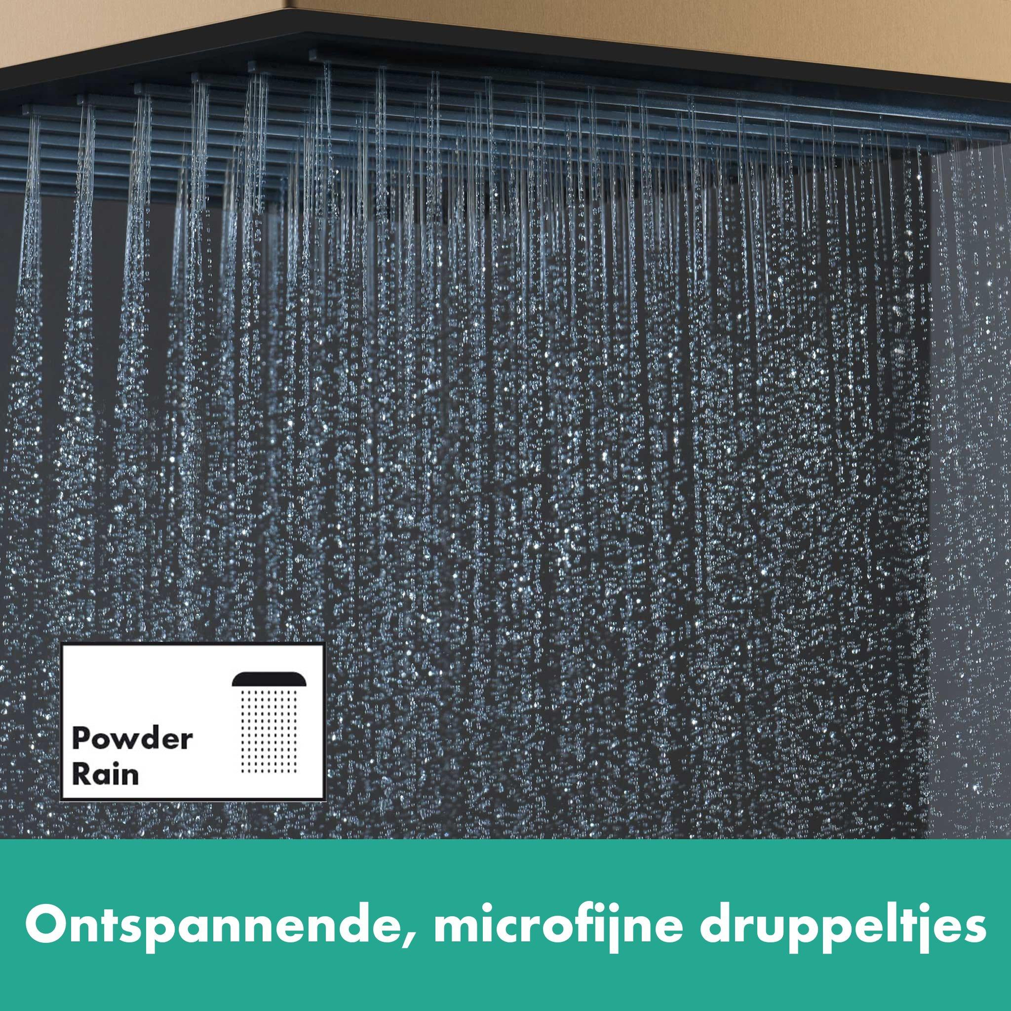 Avec la technologie innovante EcoSmart+, vous consommez jusqu'à 60 % d'eau en moins qu'avec une pomme de douche standard, sans perdre en confort. Cela signifie non seulement une facture d'eau plus basse, mais aussi une contribution consciente à l'environnement. Le jet PowderRain produit une fine brume d'eau douce qui enveloppe agréablement votre peau. Ainsi, vous profitez d'une douche rafraîchissante tout en économisant énergie et eau. Durabilité et luxe vont ici de pair.
