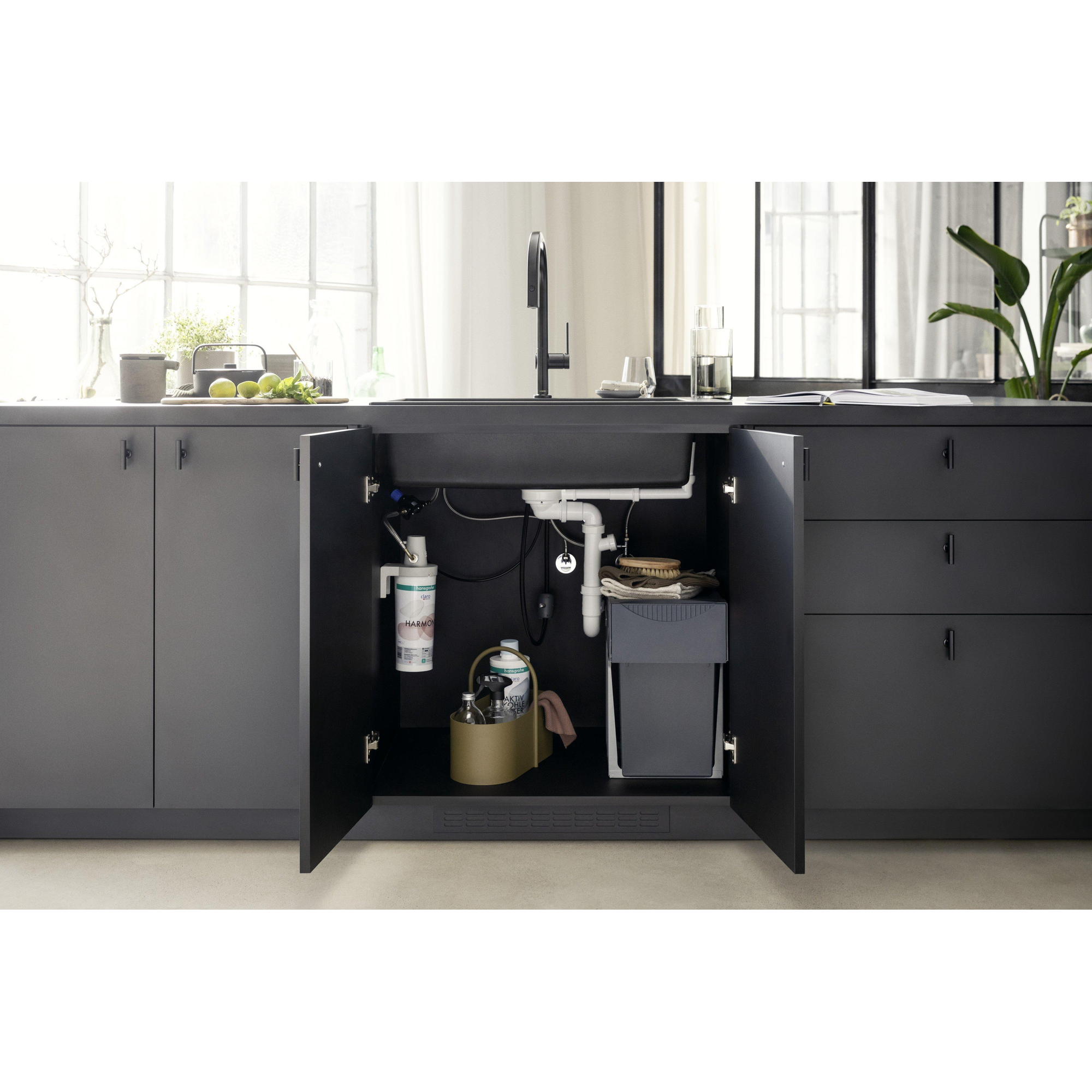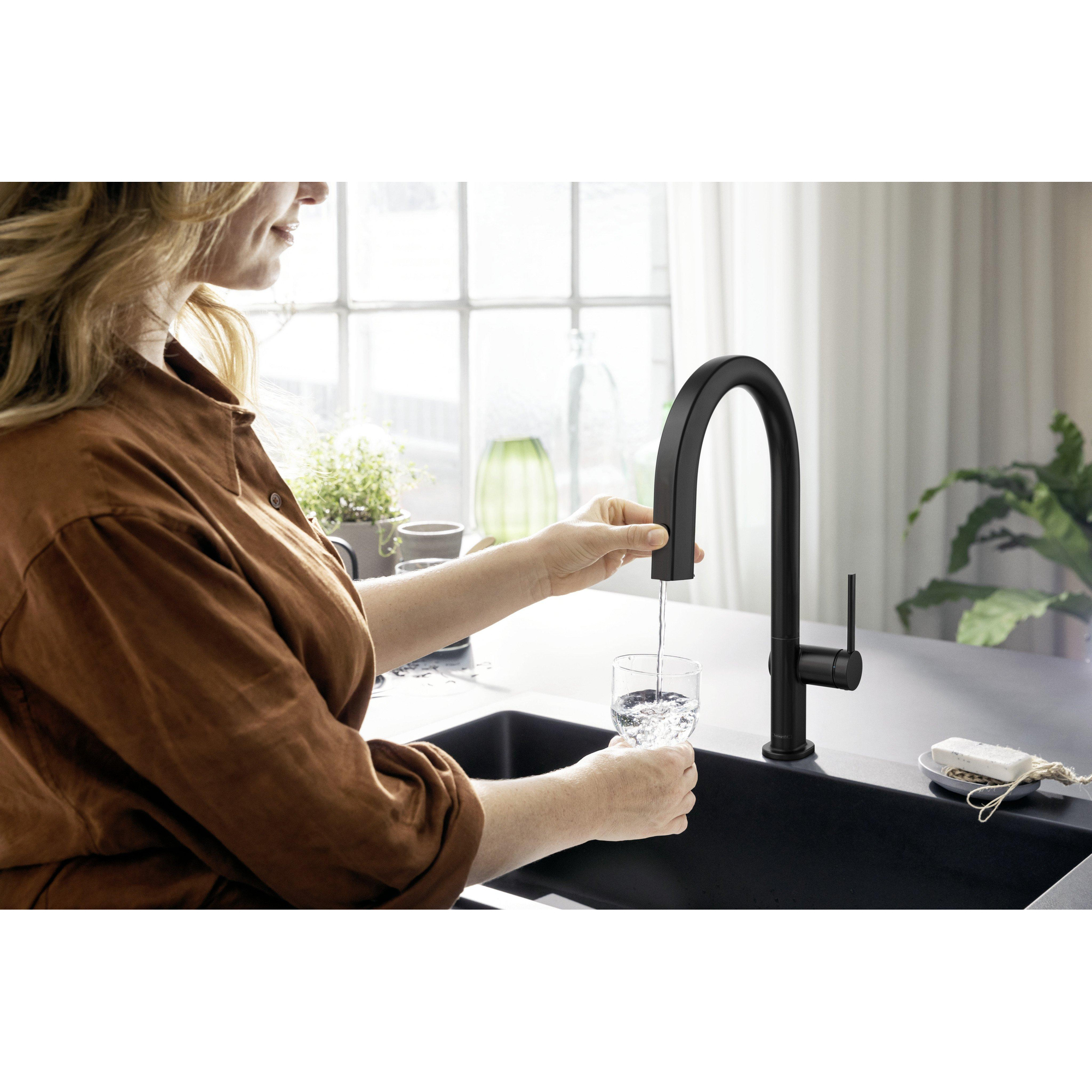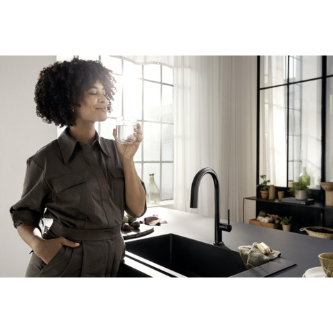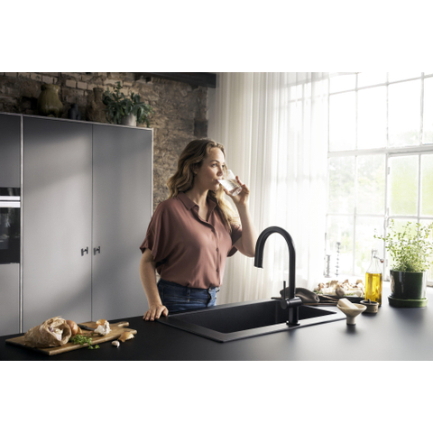 La surface noire mate de ce robinet assure une apparence intemporelle et élégante qui s'adapte sans effort aux cuisines modernes comme classiques. Le design épuré est non seulement un plaisir pour les yeux, mais aussi facile à combiner avec d'autres accessoires de cuisine. Grâce à la finition subtile, votre cuisine obtient un aspect luxueux sans être trop voyant. De plus, la surface reste belle plus longtemps car les empreintes digitales et les gouttes d'eau sont moins visibles, ce qui augmente la facilité d'entretien.