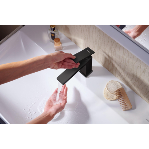 Avec son design minimaliste et sa finition noir mat, ce robinet est un véritable accroche-regard. Les formes géométriques nettes s'intègrent parfaitement dans les salles de bains modernes et offrent une apparence luxueuse sans dominer. Le design carré est magnifiquement complété par le large jet WaterfallStream, qui est non seulement esthétique mais offre également une expérience d'eau agréable. Grâce à cette conception élégante, vous ajoutez immédiatement du caractère à votre lavabo, donnant à votre salle de bains une atmosphère contemporaine et raffinée.