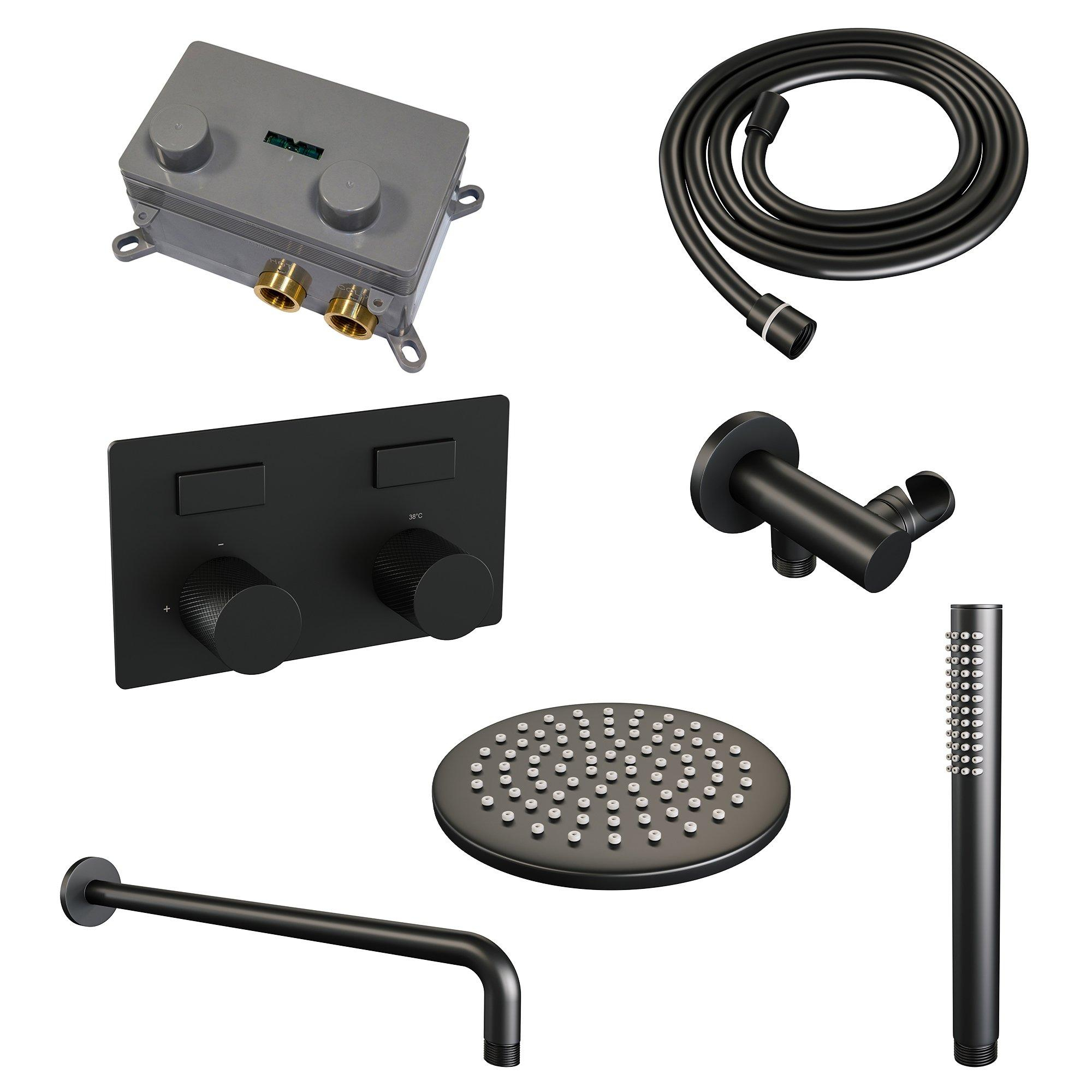BRAUER Black Carving Douche de pluie thermostatique encastrée - boutons-poussoirs - SET 51 - pomme de douche 20cm - bras mural courbé - douchette barre - flexible de douche - coude de raccordement mural - noir mat