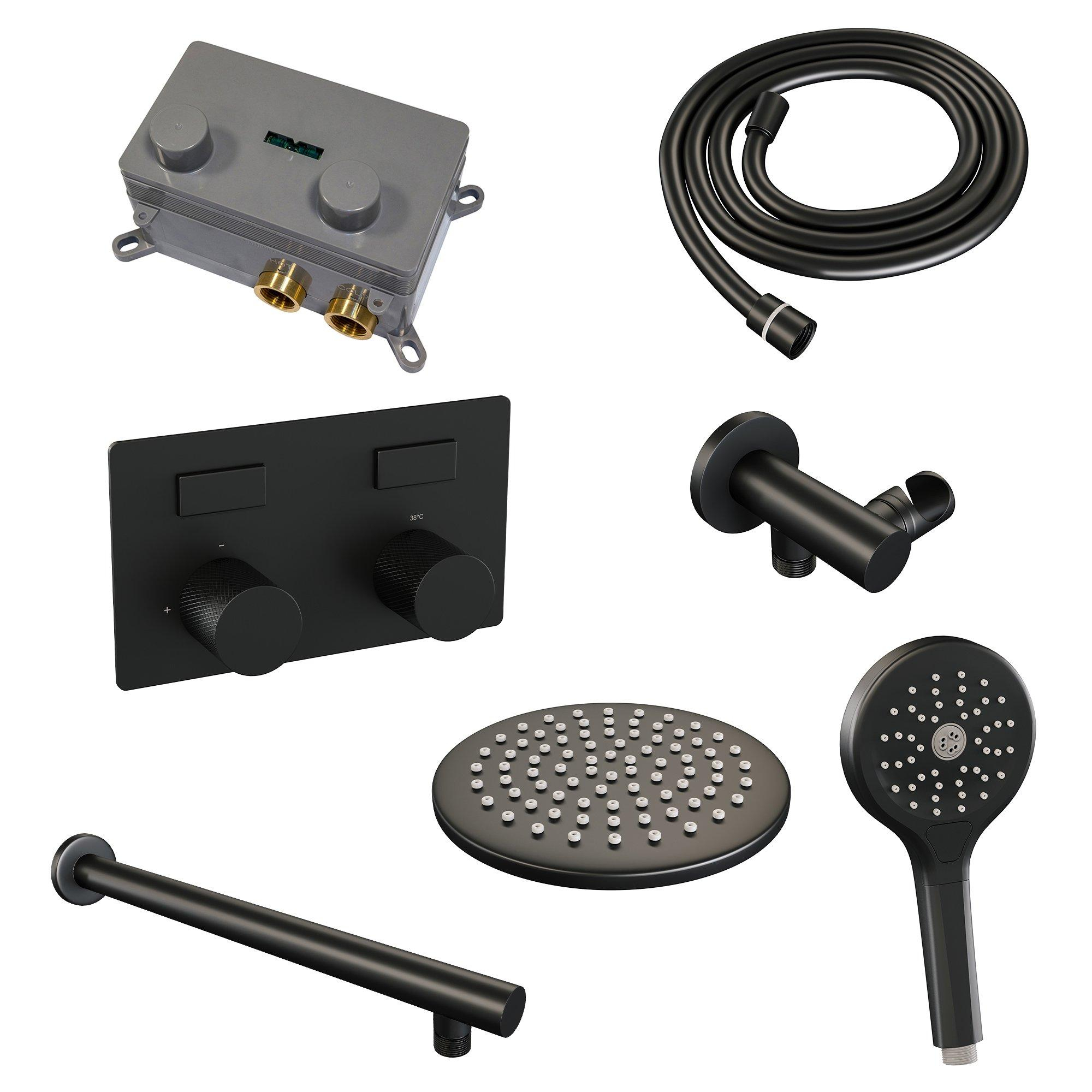BRAUER Black Carving Douche de tête thermostatique encastrée - douche de pluie - boutons-poussoirs - SET 55 - douche de tête 20 cm - bras mural droit - douchette 3 jets - flexible de douche - coude de raccordement mural - noir mat