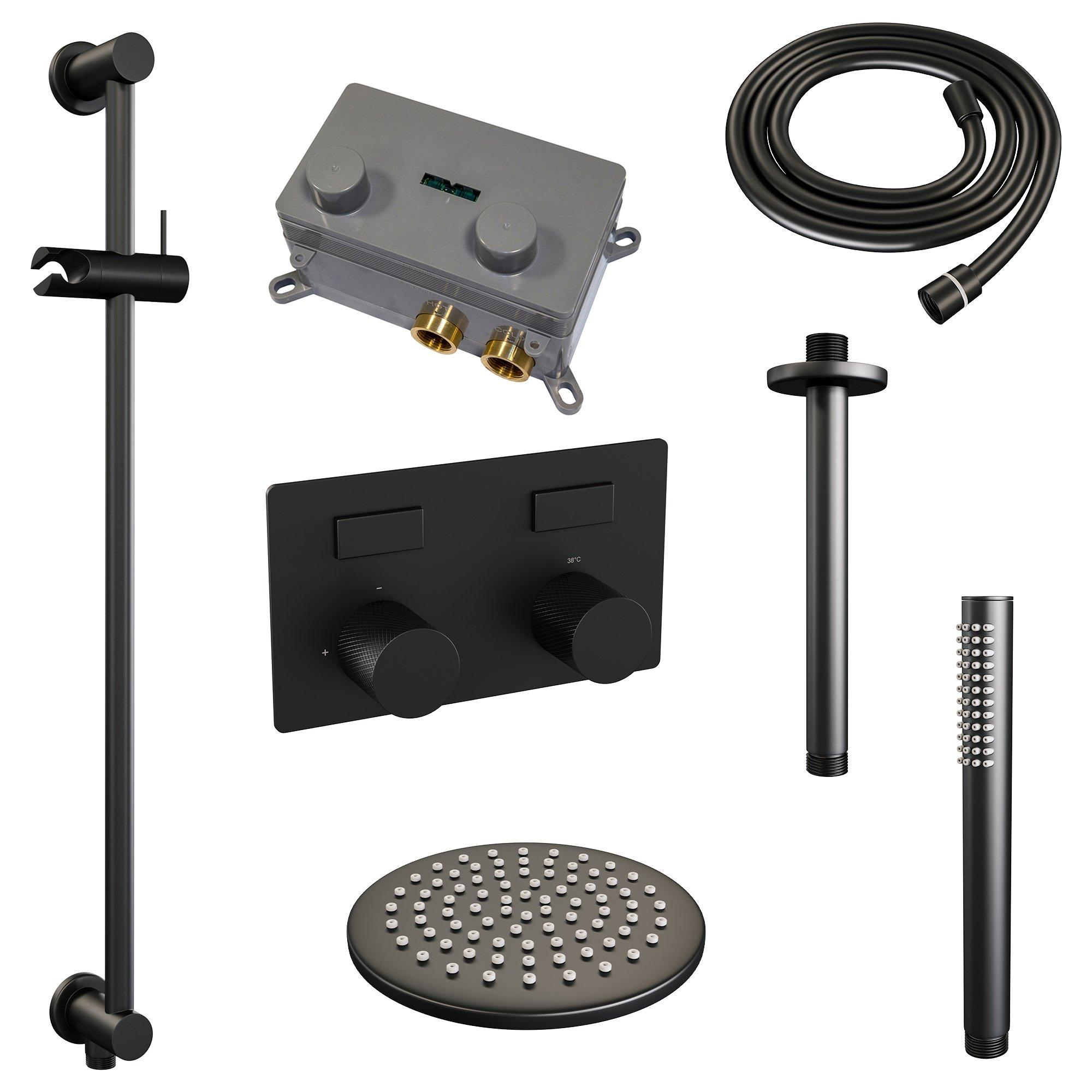 BRAUER Black Carving Douche de pluie thermostatique encastrée - boutons-poussoirs - SET 65 - tête de douche 20cm - bras de plafond - douchette barre - flexible de douche - barre de douche intégrée - noir mat