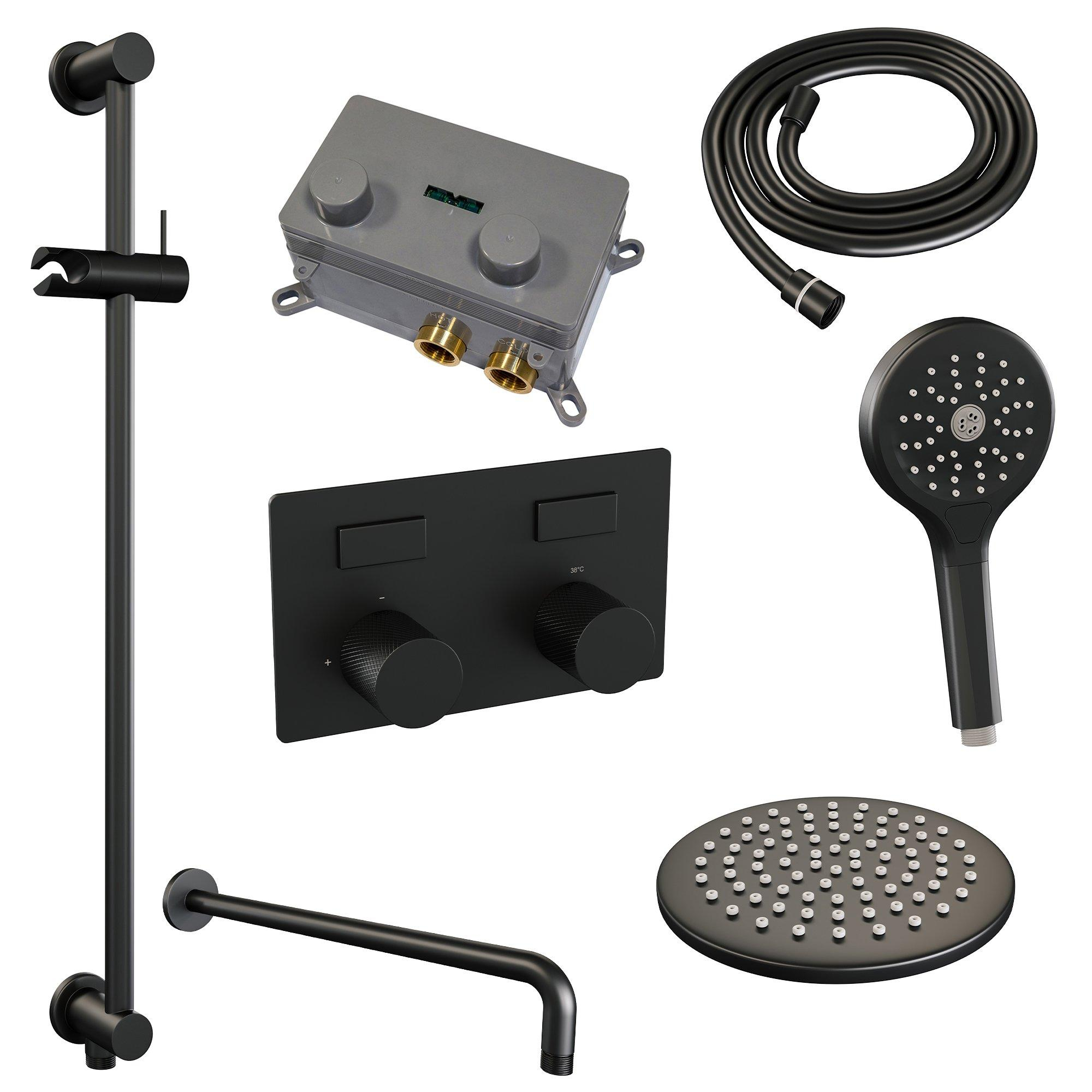 BRAUER Black Carving Douche de pluie thermostatique encastrée - boutons poussoirs - SET 69 - douche de tête 20cm - bras mural courbé - douchette 3 jets - flexible de douche - barre de douche intégrée - noir mat