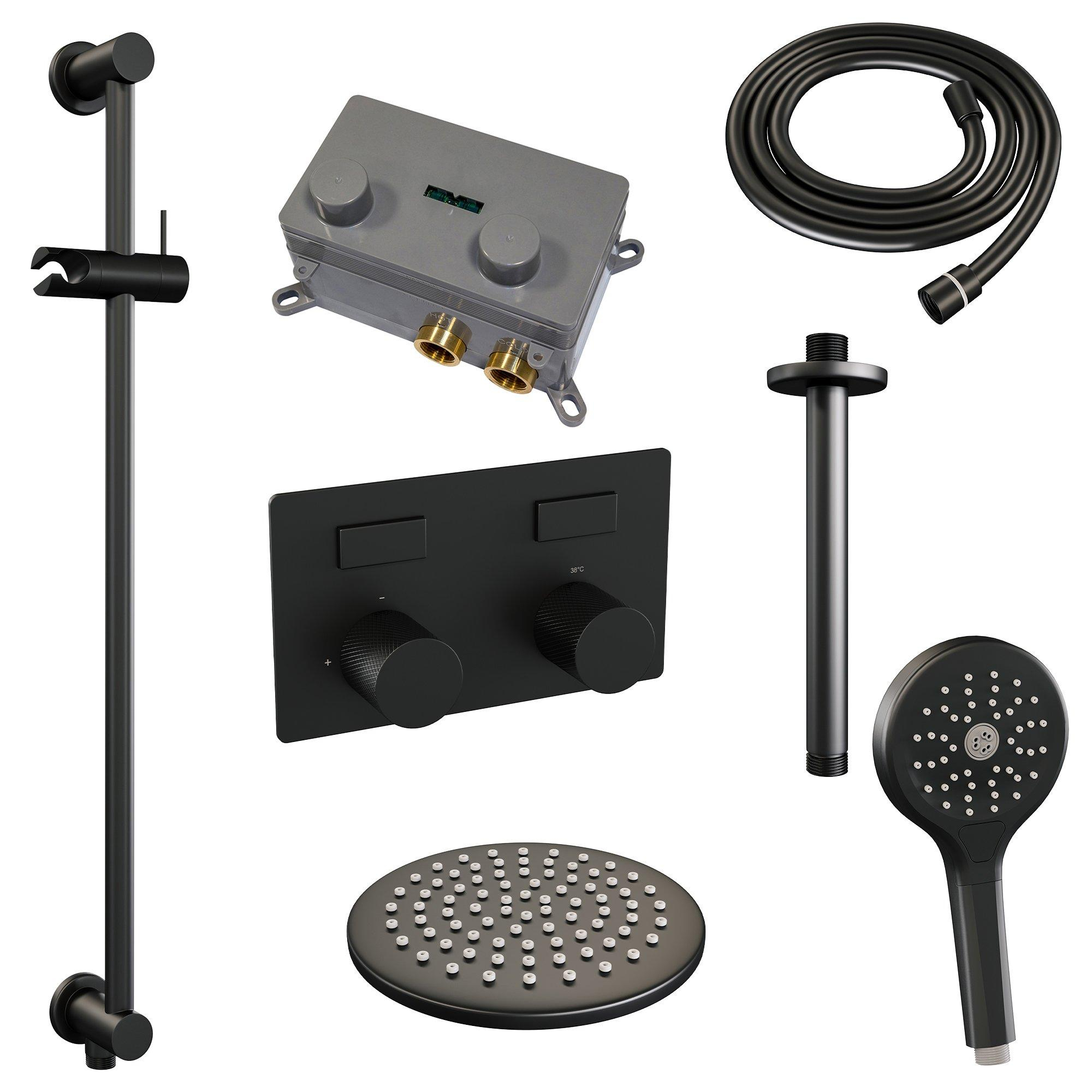 BRAUER Black Carving Douche de pluie thermostatique encastrée - boutons-poussoirs - SET 71 - tête de douche 20cm - bras de plafond - douchette 3 jets - flexible de douche - barre de douche intégrée - noir mat
