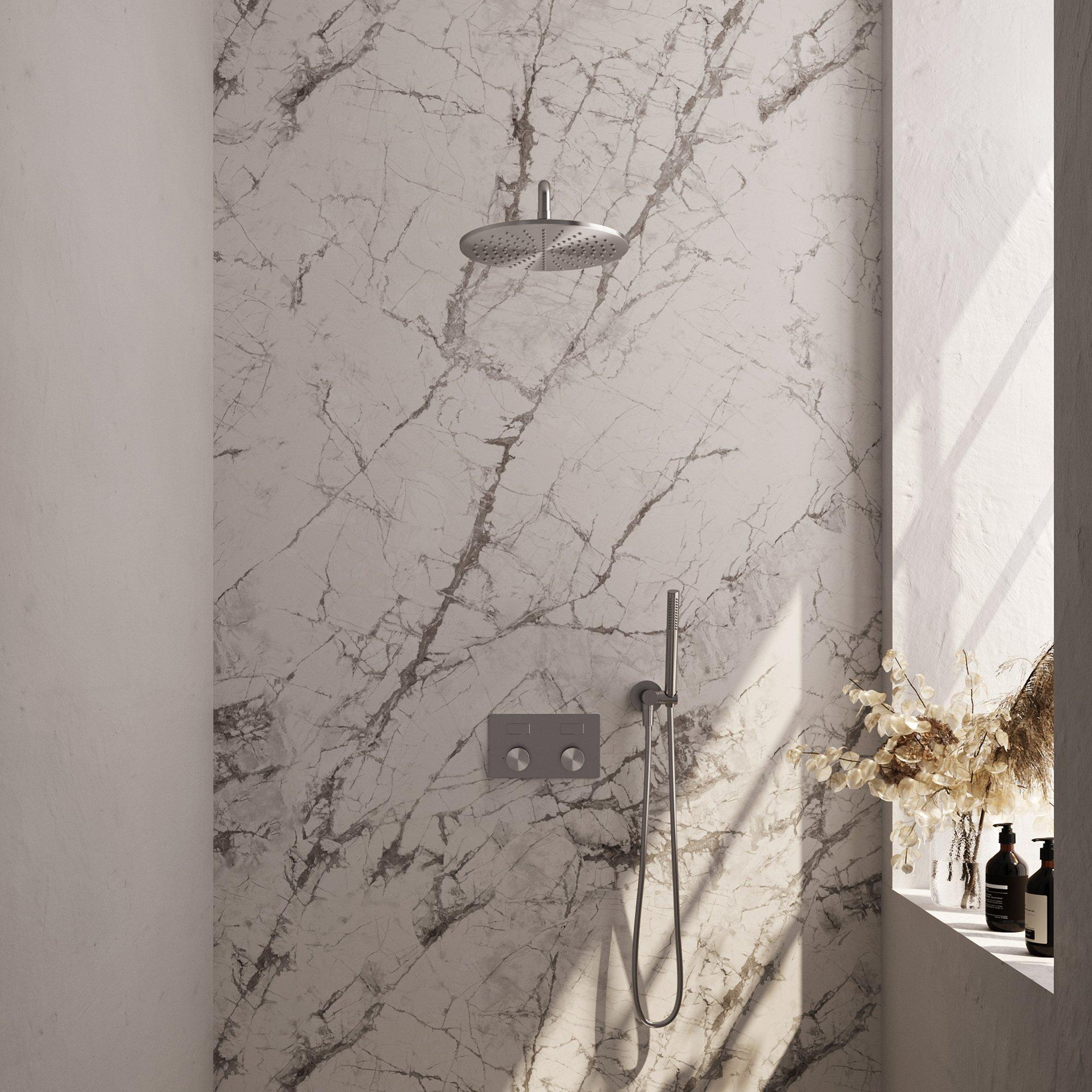 BRAUER Brushed Carving Douche de pluie thermostatique encastrée - boutons-poussoirs - SET 52 - pomme de douche 30cm - bras mural courbé - douchette à main barre - flexible de douche - coude mural - inox brossé PVD