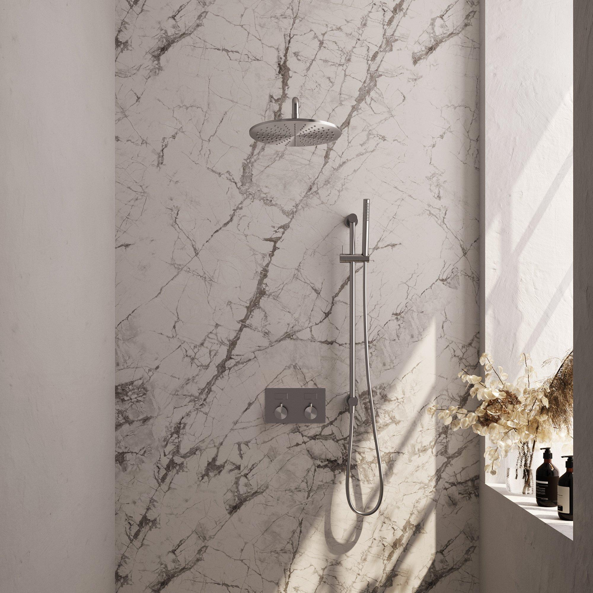 La Douche de pluie thermostatique Brushed Edition respire le style et la classe. Le design courbé du bras mural et les lignes épurées de la pomme de douche créent une apparence moderne et raffinée. La barre de douche intégrée et la douchette barre ajoutent de la fonctionnalité au design élégant, rendant cette douche de pluie à la fois visuellement attrayante et pratique.