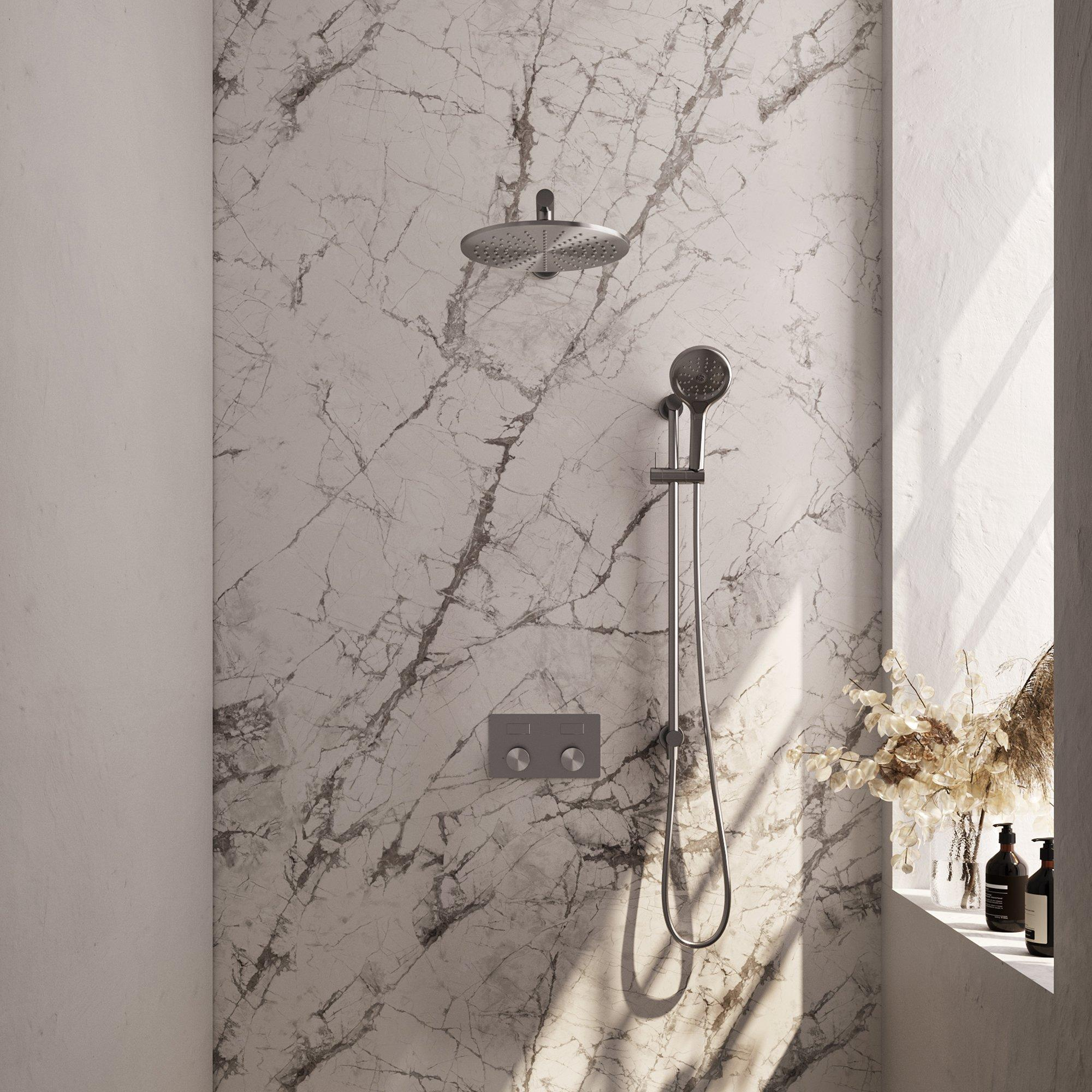 La Brushed Edition Douche de pluie thermostatique respire le style et la classe. Le design PVD en acier inoxydable brossé apporte une touche moderne à votre salle de bains. La combinaison de la douche de tête 30 cm et du bras mural droit offre un look minimaliste qui s'intègre parfaitement dans un aménagement contemporain.