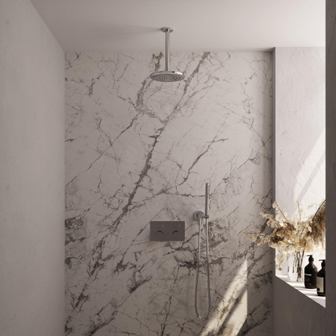 Découvrez le luxe ultime avec la BRAUER Chrome Carving douche de tête thermostatique encastrée. La douche de tête est équipée d'un bras de plafond pour une répartition de l'eau magnifique et uniforme. La finition chromée ajoute une touche d'élégance à l'intérieur de votre salle de bains. La douche de tête est livrée avec un flexible de douche et un coude d'alimentation mural pour une expérience de douche complète et luxueuse.