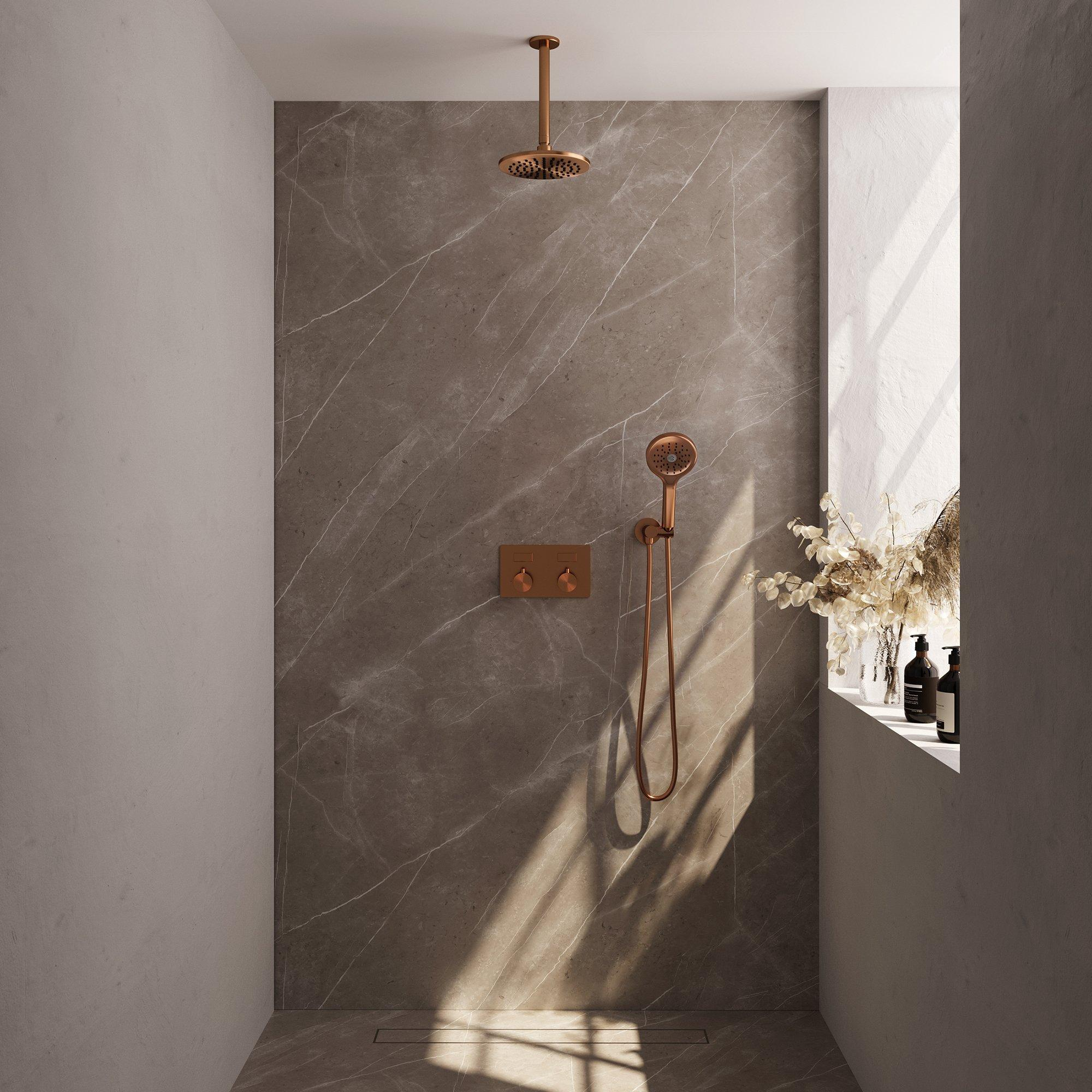 Avec cet ensemble complet de douche de pluie encastrée, vous apportez une ambiance d’hôtel de luxe dans votre propre salle de bains. La combinaison d’une grande tête de douche sur un bras de plafond épuré, d’une douchette pratique à trois jets et du mitigeur thermostatique intelligent avec boutons-poussoirs en fait un choix idéal pour qui souhaite combiner confort, design et facilité d’utilisation. La couleur cuivre brossé donne immédiatement à votre espace douche une apparence chaleureuse et moderne et s’harmonise parfaitement avec des matériaux naturels, des accents noirs ou un style industriel. Grâce au montage encastré, l’ensemble offre un aspect calme et minimaliste, tout en permettant de profiter d’une expérience de douche complète et confortable. Parfait aussi bien pour une nouvelle salle de bains design que pour une rénovation haut de gamme dont vous profiterez longtemps.