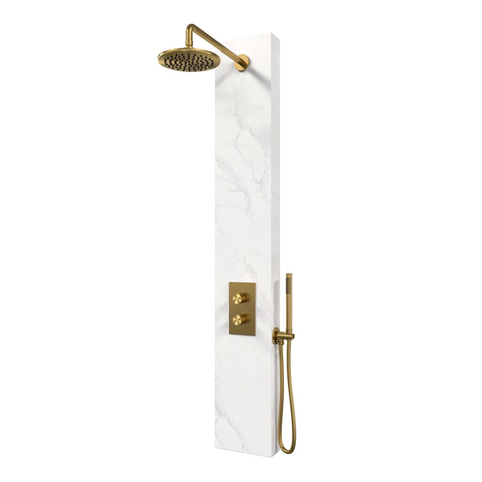BRAUER Gold Edition panneau de douche thermostatique - 2 fonctions - calacatta gold SET 01 - douche de tête 20 cm - bras mural courbé - douchette barre - coude de raccordement mural - flexible de douche - or brossé PVD