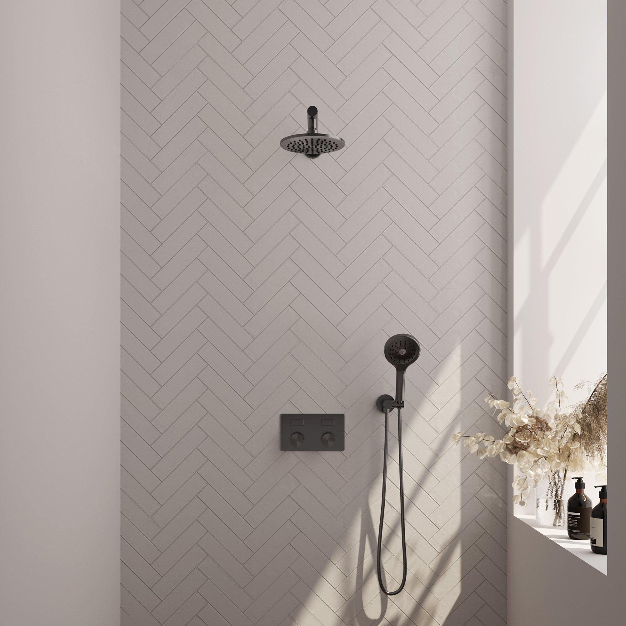 La finition gunmetal brossé PVD de cette douche de tête donne un aspect moderne et luxueux à votre salle de bains. Le design épuré et les boutons poussoirs assurent un look minimaliste qui s'intègre parfaitement dans un aménagement contemporain. Cette douche de tête n'est pas seulement fonctionnelle, mais aussi un élément de décoration stylé dans la salle de bains.