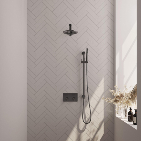 La BRAUER gunmetal Carving Douche de pluie thermostatique encastrée est conçue avec un design contemporain et épuré qui s'accorde parfaitement avec les salles de bains modernes. La finition gunmetal brossé PVD donne à la douche un aspect luxueux et constitue un ajout élégant à l'intérieur de votre salle de bains. Les boutons-poussoirs permettent d'ajuster facilement la température et le débit de l'eau, ce qui vous permet de toujours profiter d'une expérience de douche confortable.