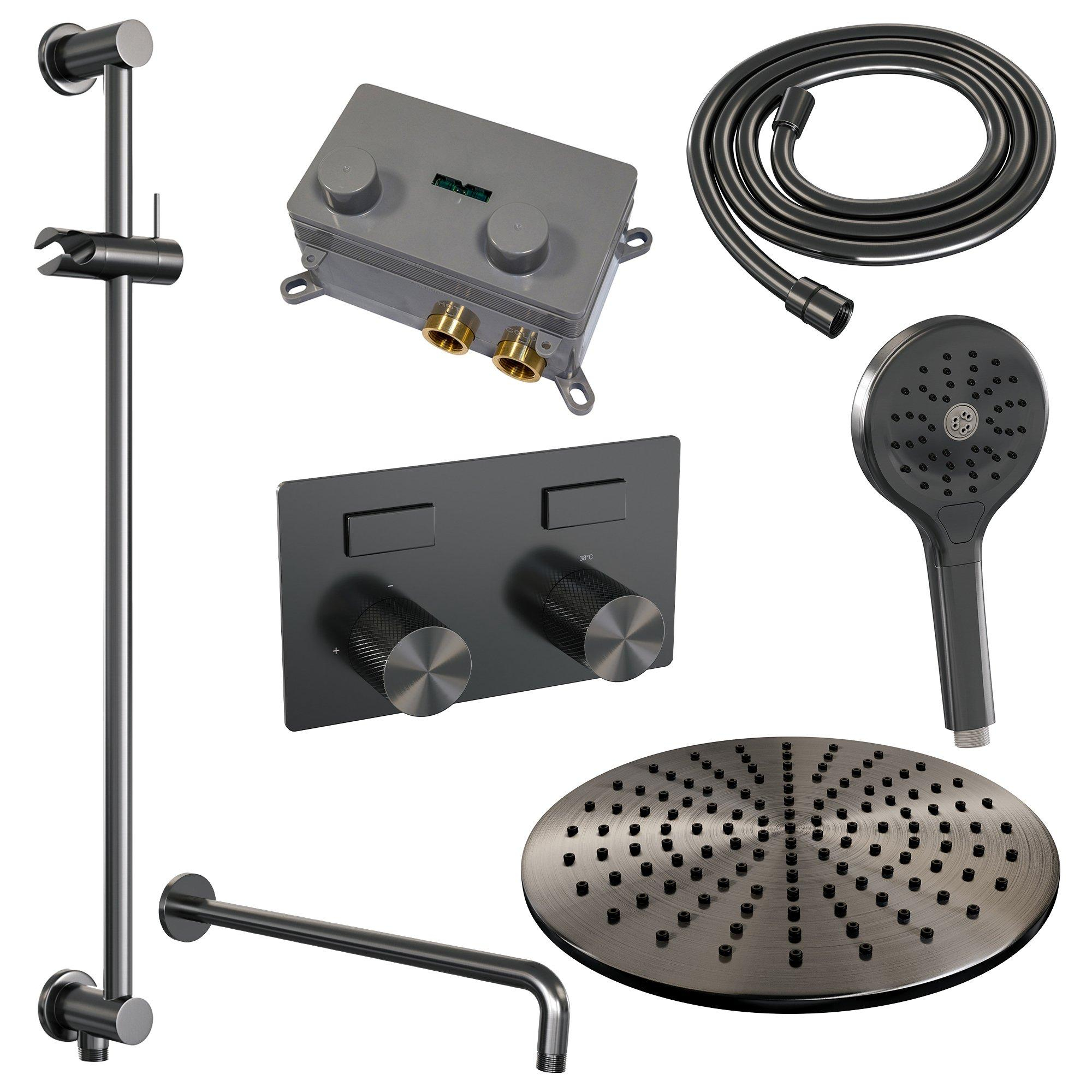BRAUER gunmetal Carving Douche de pluie thermostatique encastrée - boutons-poussoirs - SET 70 - tête de douche 30cm - bras mural courbé - douchette 3 jets - flexible de douche - barre de douche intégrée - gunmetal brossé PVD