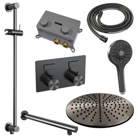 BRAUER gunmetal Edition Douche de pluie thermostatique encastrée - boutons-poussoirs - SET 68 - tête de douche 30cm - bras mural droit - douchette 3 jets - flexible de douche - barre de douche intégrée - gunmetal brossé PVD