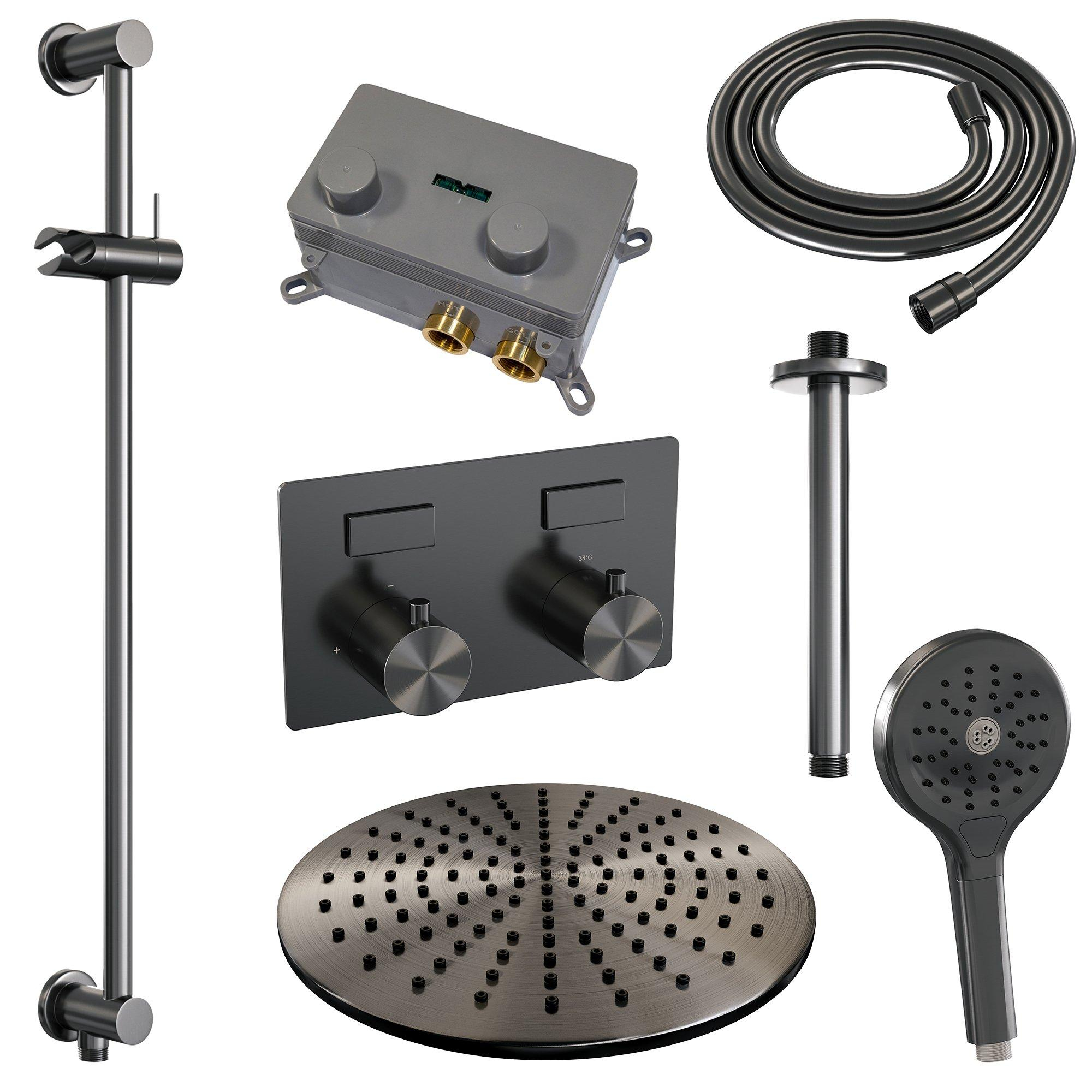BRAUER gunmetal Edition Douche de pluie thermostatique encastrée - boutons-poussoirs - SET 72 - douche de tête 30cm - bras de plafond - douchette 3 jets - flexible de douche - barre de douche intégrée - gunmetal brossé PVD