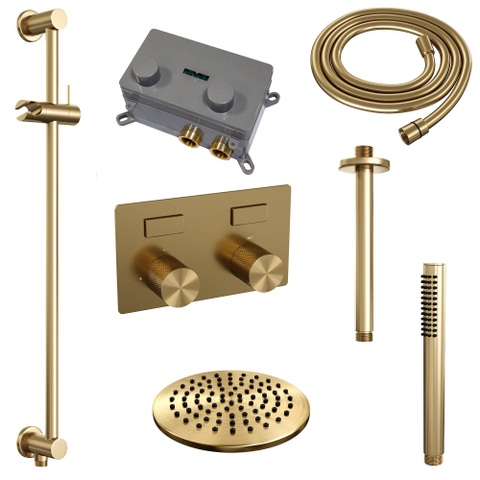 BRAUER Gold Carving Douche de pluie thermostatique encastrée - boutons-poussoirs - SET 65 - pomme de douche 20cm - bras de plafond - douchette barre - flexible de douche - barre de douche intégrée - or brossé PVD