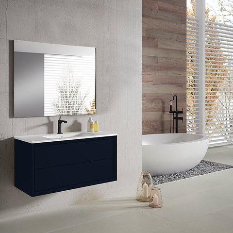 Saniclass Prime Core Ensemble meuble de salle de bains - 100x50x45cm - 1 vasque rectangulaire en céramique blanche - 1 trou de robinet - 2 tiroirs - miroir rectangulaire - bleu marine mat