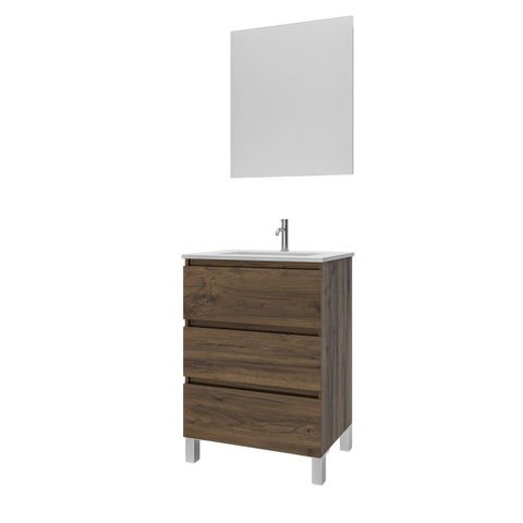 Saniclass Chaci PLUS Ensemble meuble de salle de bains - 60x86x46cm - lavabo en céramique blanc - 1 vasque - 1 trou de robinet - 3 tiroirs - miroir rectangulaire - noyer (bois)
