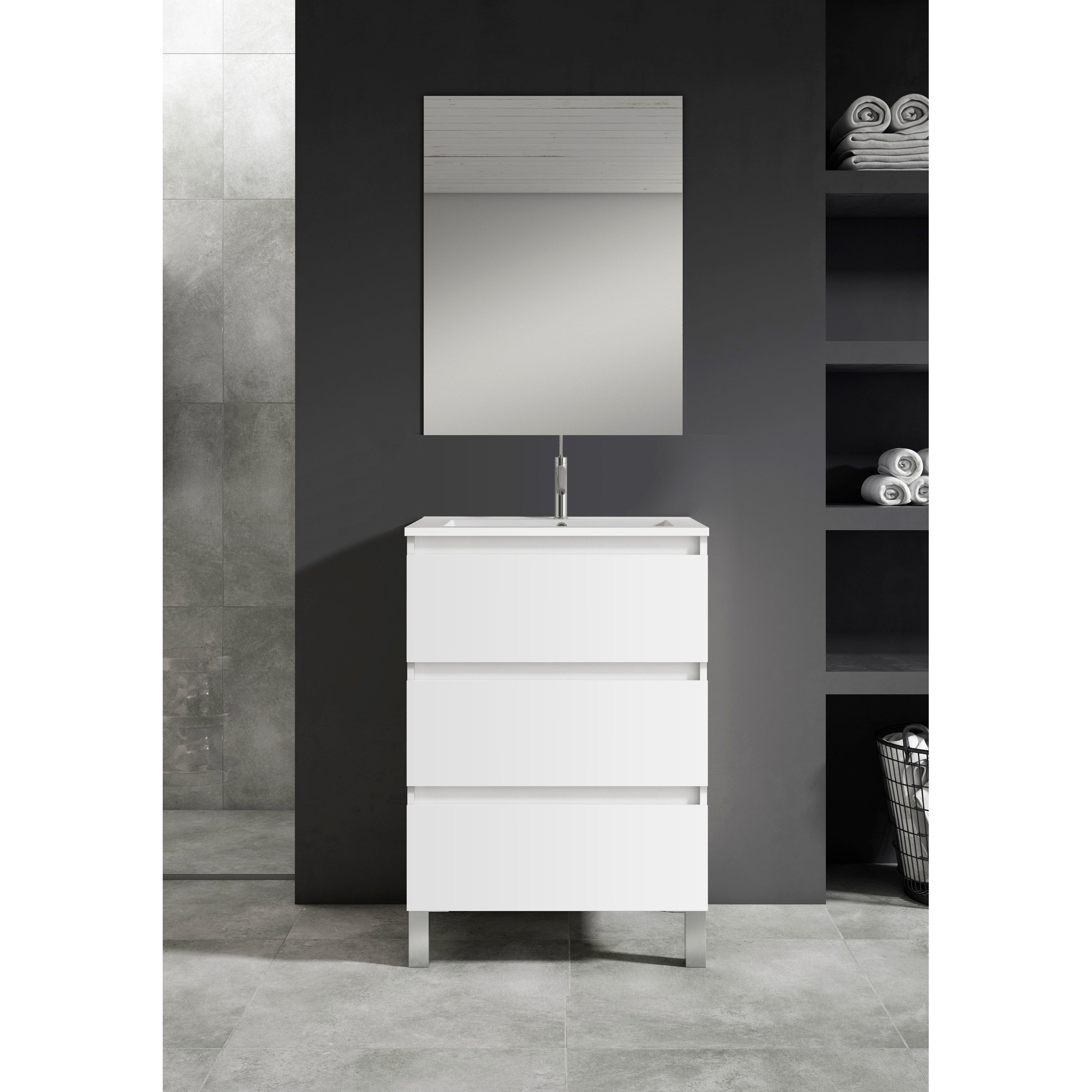 Saniclass Chaci PLUS Ensemble meuble de salle de bains - 60x86x46cm - vasque en céramique blanche - 1 vasque - 1 trou de robinet - 3 tiroirs - miroir rectangulaire - blanc mat