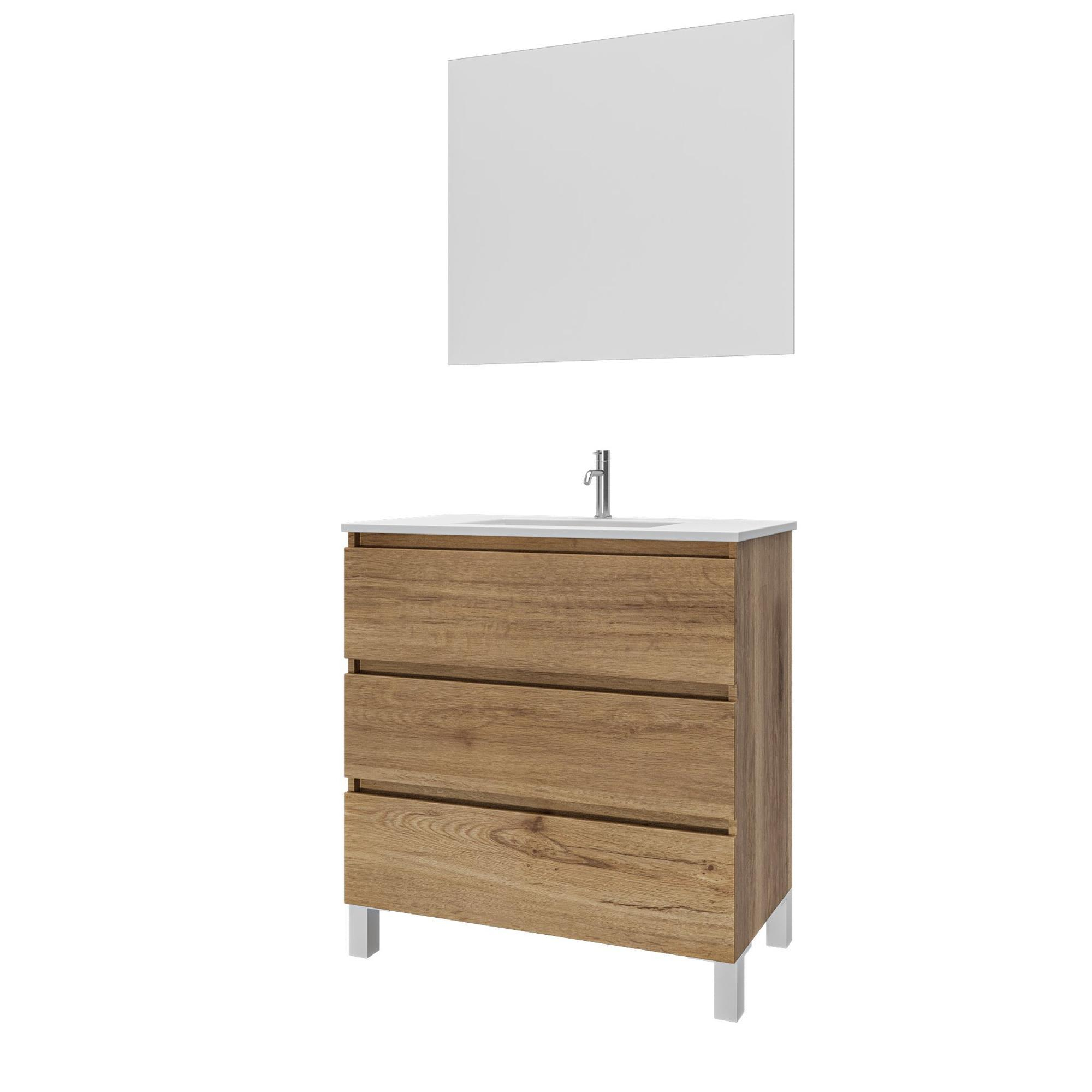 Saniclass Chaci PLUS Ensemble meuble de salle de bains - 80x86x46cm - lavabo en céramique blanc - 1 vasque - 1 trou de robinet - 3 tiroirs - miroir rectangulaire - chêne