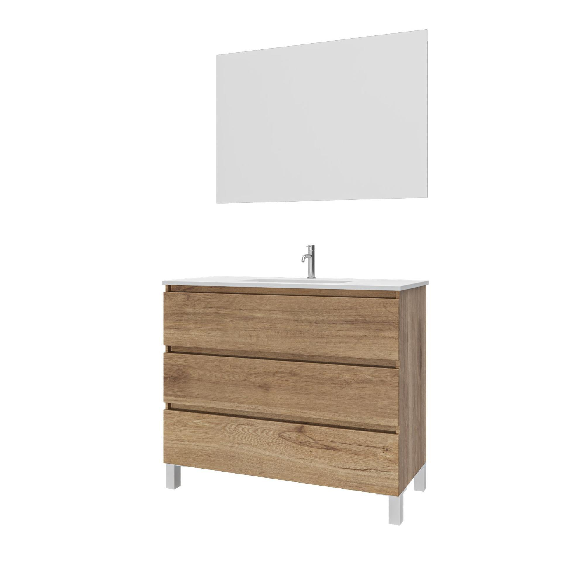 Saniclass Chaci PLUS Ensemble meuble de salle de bains - 100x86x46cm - lavabo en céramique blanc - 1 vasque - 1 trou de robinet - 3 tiroirs - miroir rectangulaire - chêne